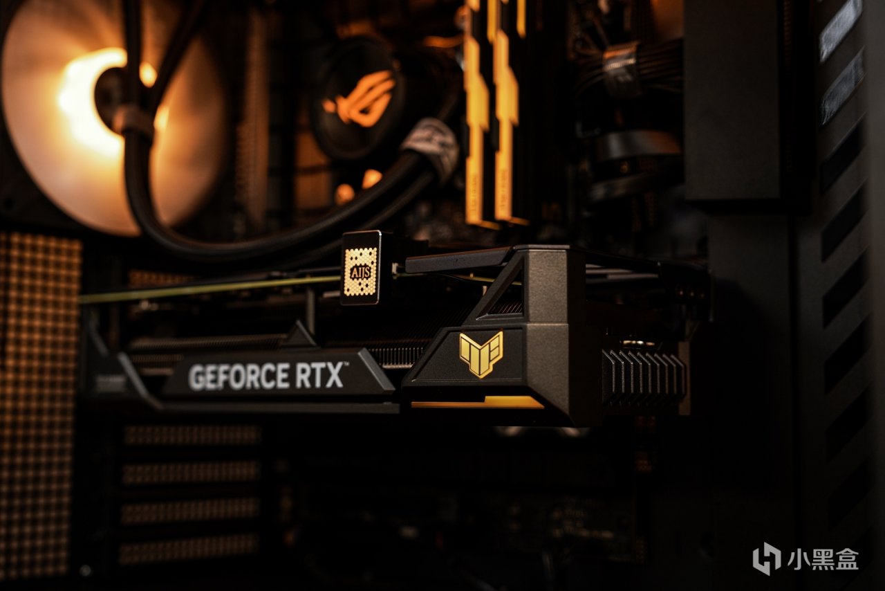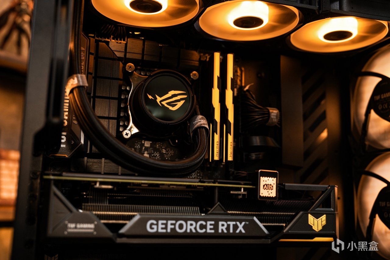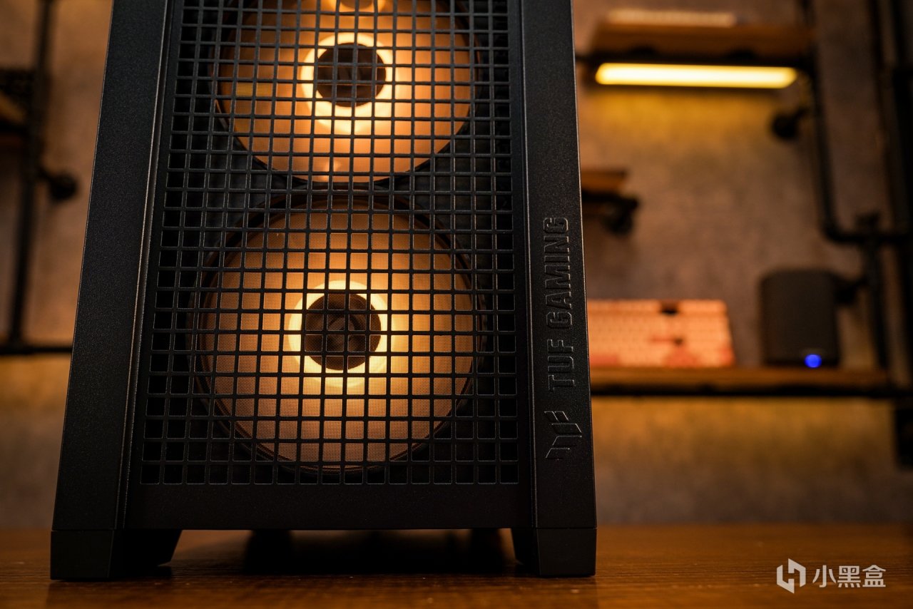 主机内部也是按照对应的色调调整的,亮机后可以看到协调一致的灯效衬托的氛围感就展现出来了。黑金配色也和TUF系列产品色调定位是一致的,所以更直观的还原出最经典的主机配色。