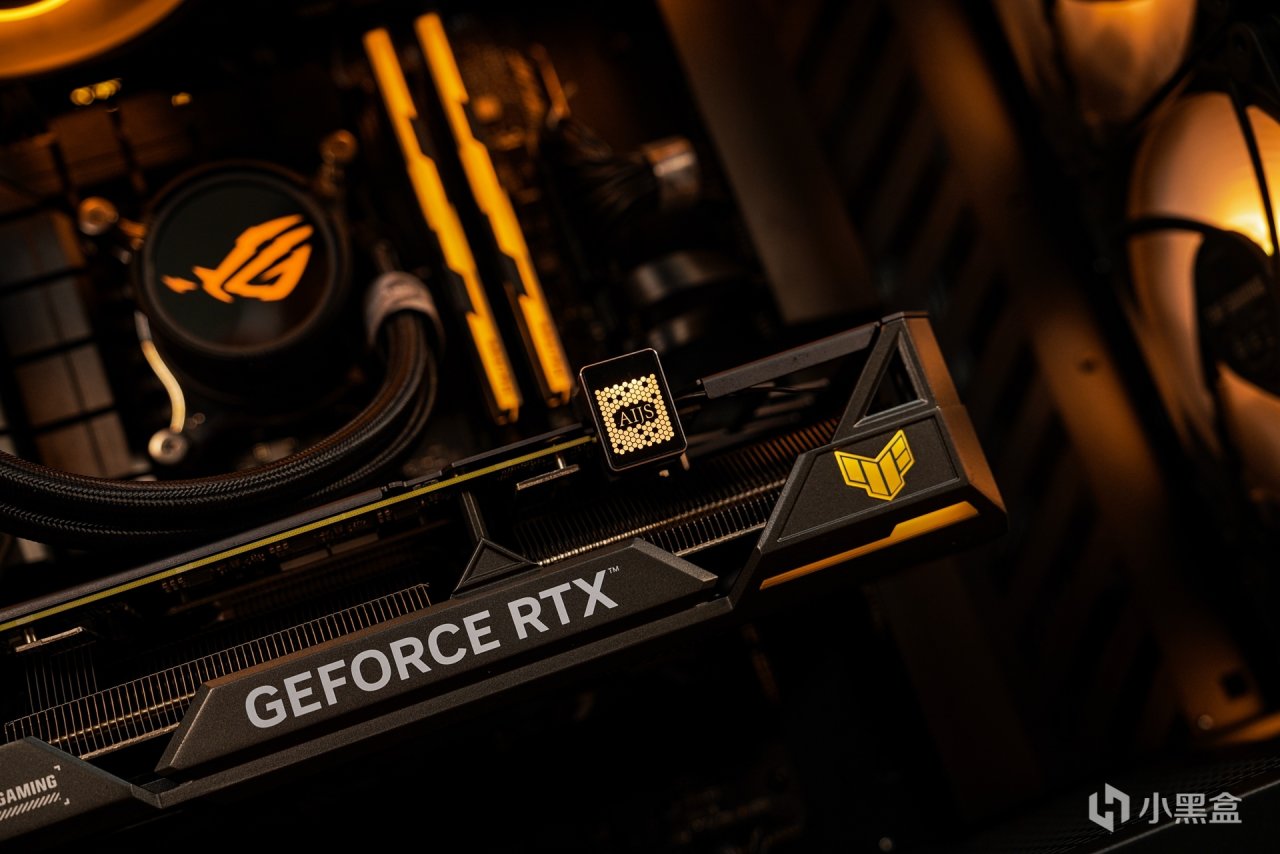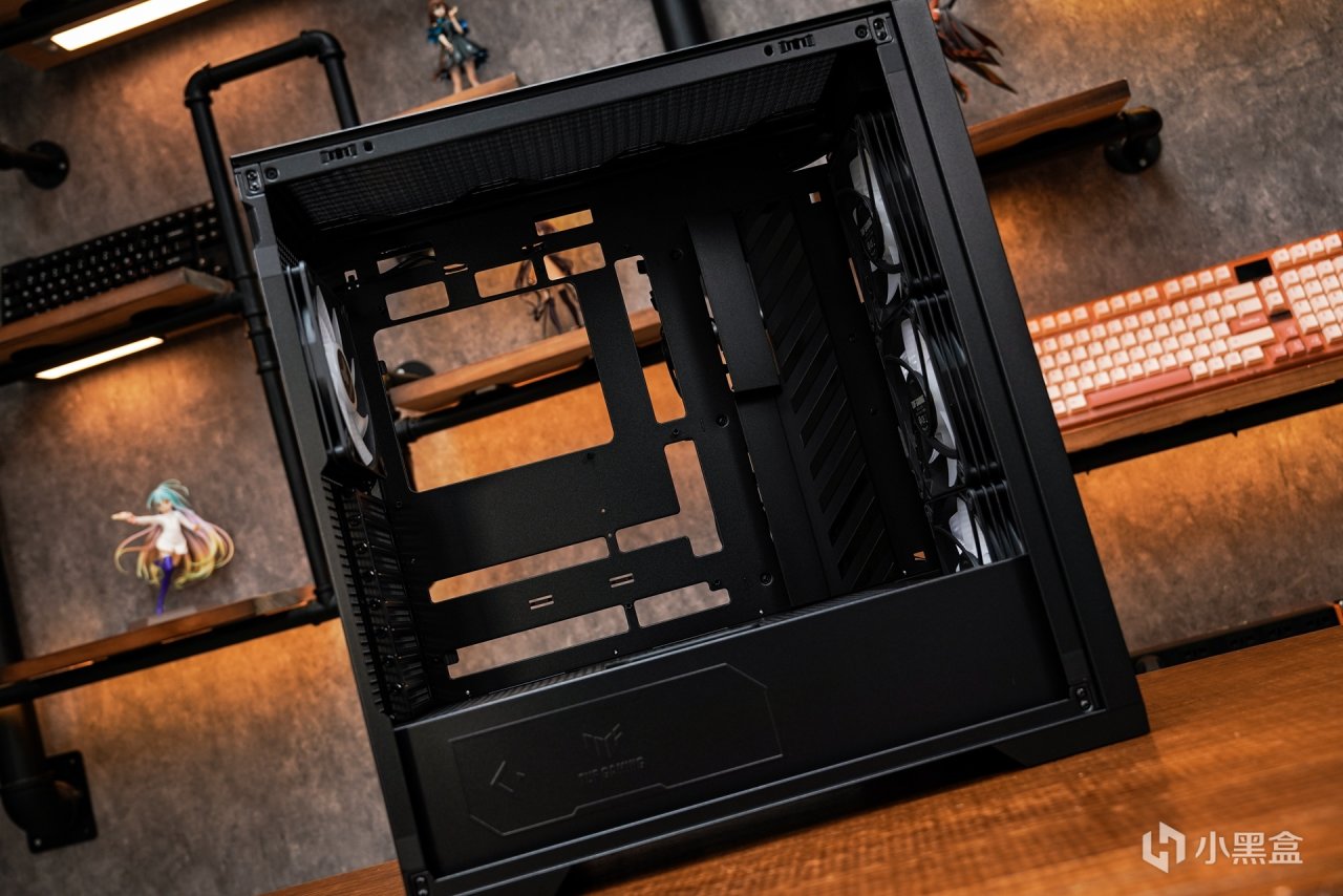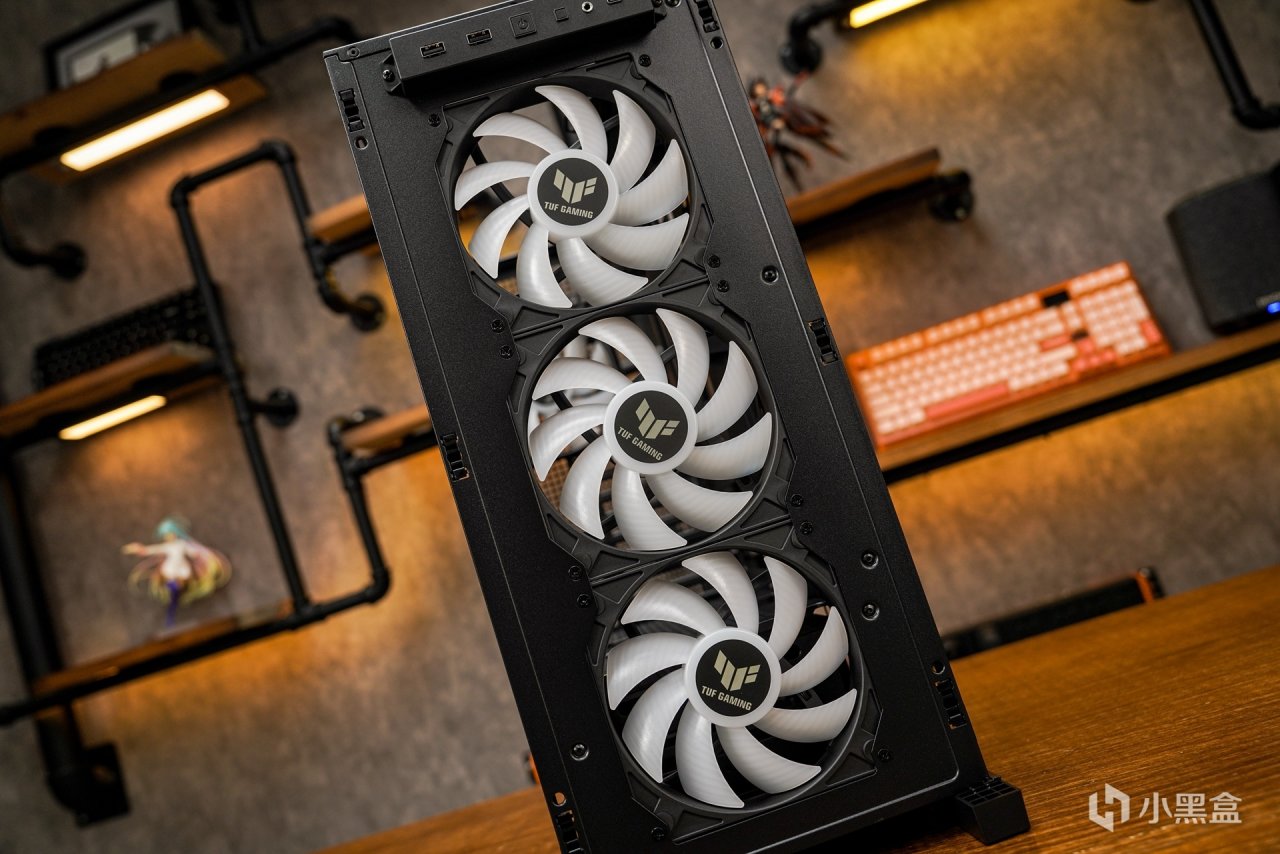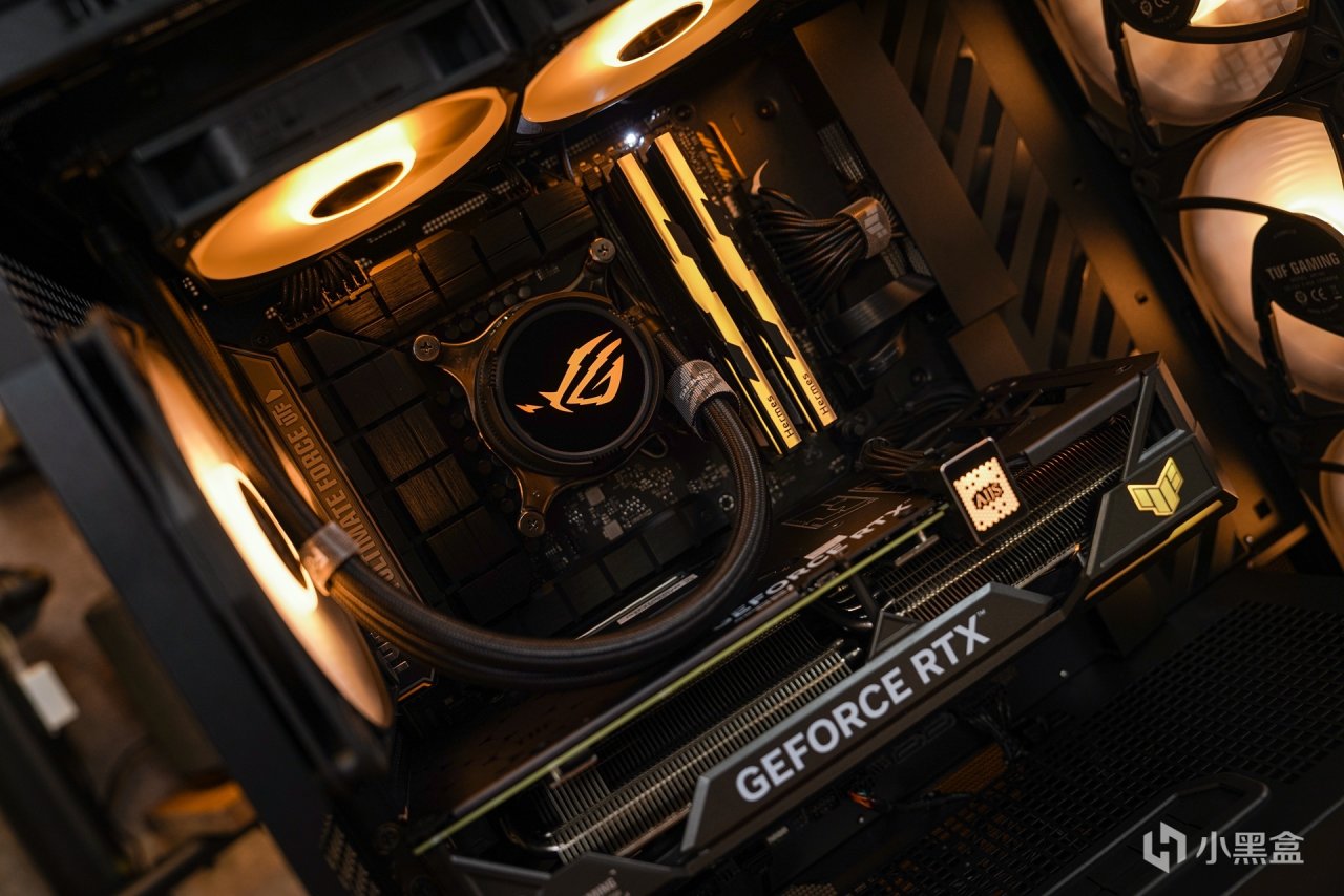 主机内部也是按照对应的色调调整的,亮机后可以看到协调一致的灯效衬托的氛围感就展现出来了。黑金配色也和TUF系列产品色调定位是一致的,所以更直观的还原出最经典的主机配色。