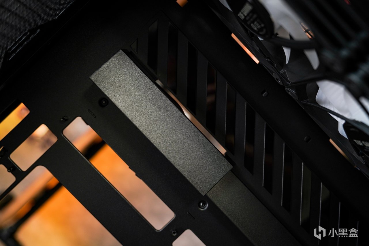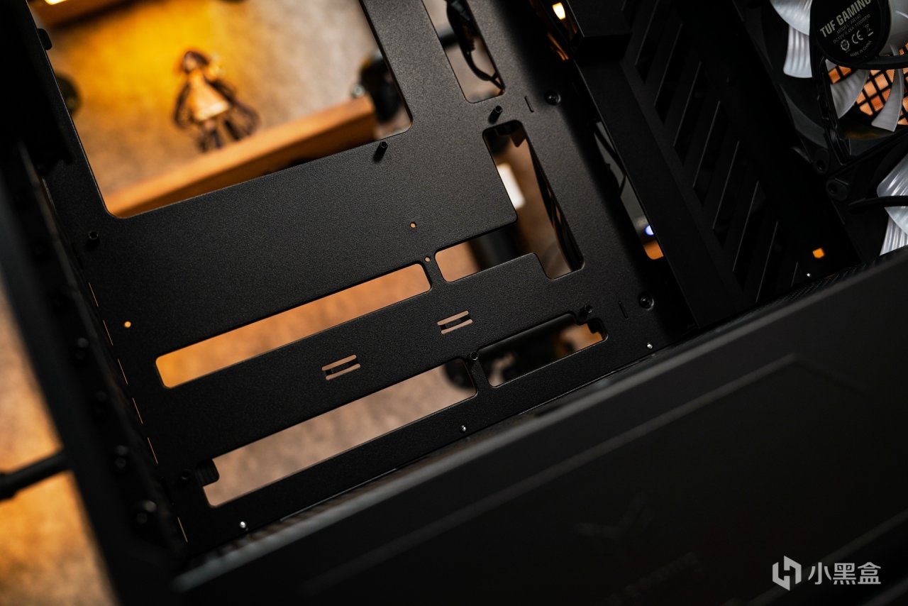 在机箱细节上,箱体内的电源舱上有金属冲压LOGO来突显这款机箱属于TUF系列的产品,和机箱前置面板右下侧的LOGO相呼应。还有就是机箱内部一些小装饰也是很有自己的特色的,比如挡线装饰板和右侧的条纹装饰板,别小看这些不起眼的装饰,这样的设计让内部更具辨识度。而箱体的五金厚度也是非常的扎实,测厚仪实际测量五金厚度为1MM。