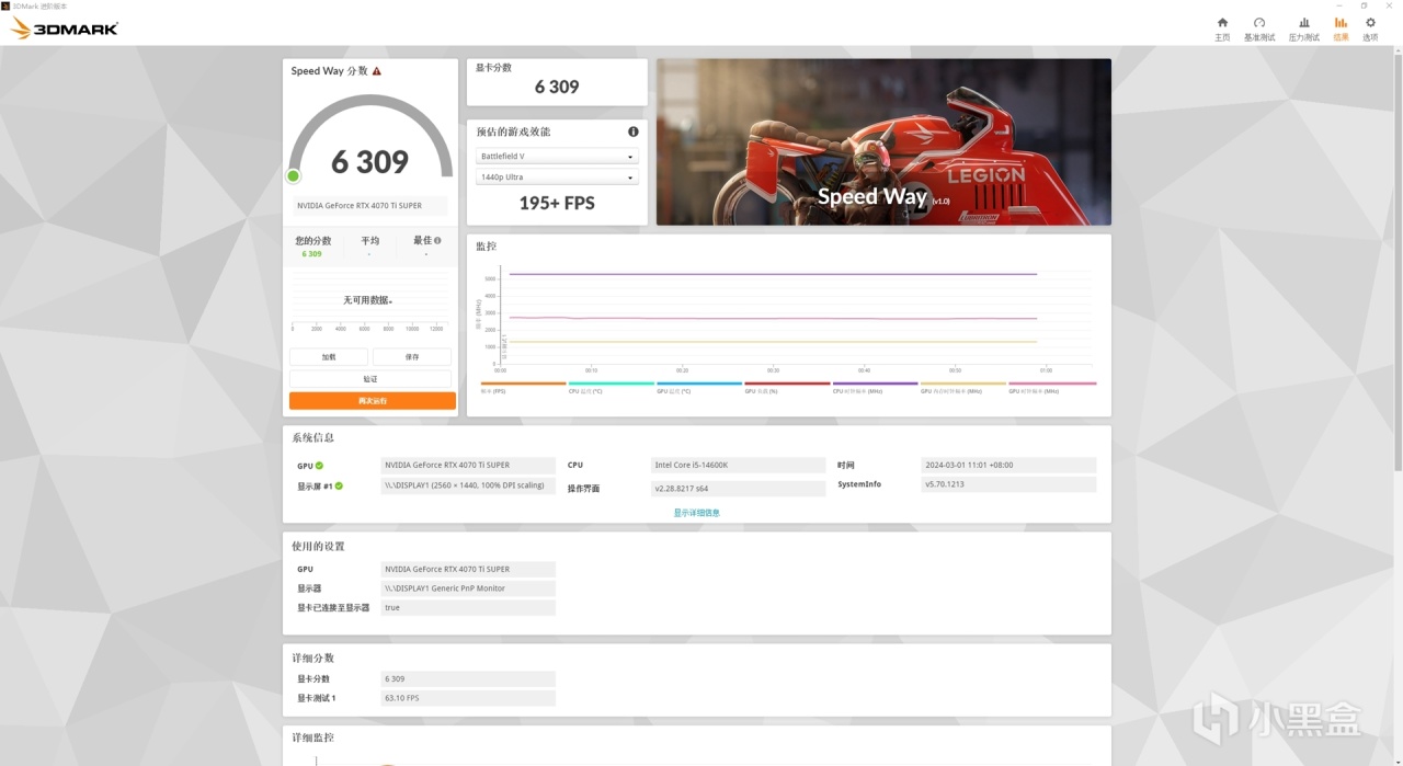 3D MARK 分为Speed Way 基准测试里的显卡得分为:6309。DX12 2K Time Spy综合得分:22933 平均FPS为 200+FPS,DX12 4K Time Spy Extreme 综合得分为:11060 平均FPS为:200+FPS。NVIDIA DLSS 功能测试:关闭DSLL的平均帧数为72.24FPS,开启DSLL 166.53FPS。