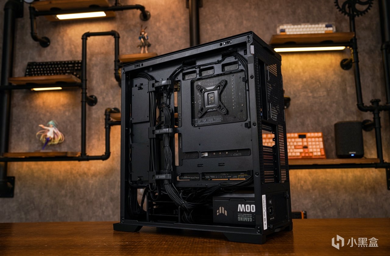 桌面效果在开篇已经有完整的展示了,在主机展示部分就会着重于外观和内部的展示。虽然这次使用的并不是TUF BTF背插系列的硬件,但是TUF302装弹库机箱是完全可以支持这套常规配件安装的,总而言之“无线”背插有无线背插的特色,常规装机应该更符合大多数玩家的需求使用。外观上,黑色箱体对比白色箱体在配色上个人感觉应该用更为鲜明的色调来搭配,这样既可让黑色箱体突显它的纯黑质感,又可让对整体沉闷的黑色得到视觉差异的一种补充。