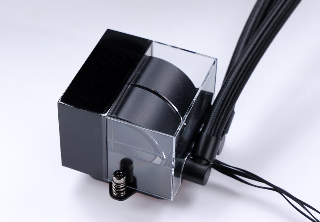 冷头方面,这款水冷也称得上是独具匠心,左侧为一块数显屏幕,搭配上水冷配套软件可以显示CPU的温度信息。右侧则为高透光材质的全景视窗设计,透过透明顶盖,玩家可以清楚地看到冷头内部经过高精度CNC工艺和阳极喷砂工艺处理过的“双腔体”水泵外壳结构,以及围绕在“双腔体”结构四周的镜面ARGB灯环设计;最高转速可达3200RPM的静音马达搭配上冷头内部的微水道结构,可以快速将处理器产生的热量传入冷排,大大提升了水冷的解热效能;