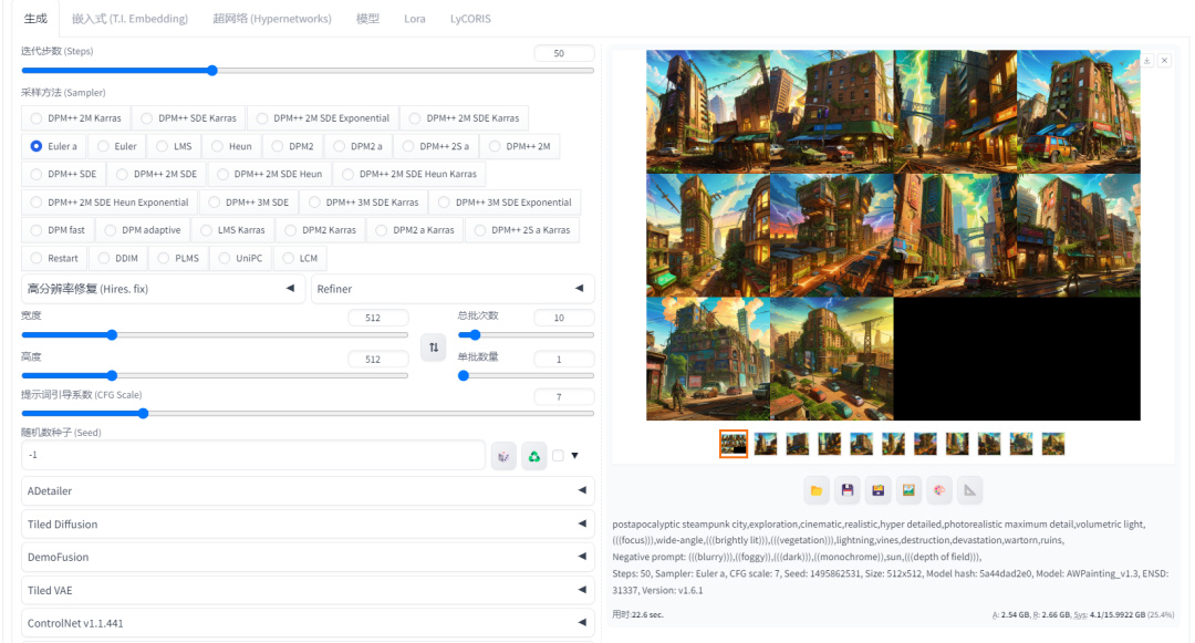 保持其他设置不变,只将Batch count(批次数量)改为10,再次测试。在不开启Tensor RT加速引擎时,显卡生成1张图片耗时为2.26秒左右,而开启Tensor RT加速引擎后,显卡生成1张图片耗时则为1.39秒左右;