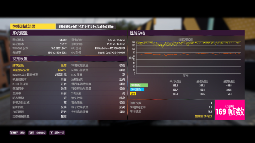 《极限竞速·地平线5》测试,极端画质,极端光追,开启DLSS 3.0并设为超级性能模式,4K分辨率下,游戏平均帧数169 FPS;