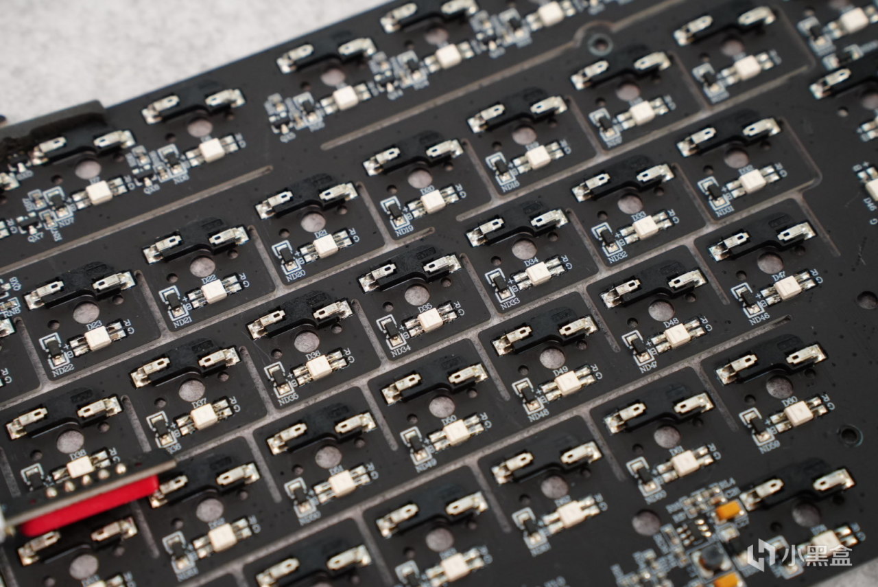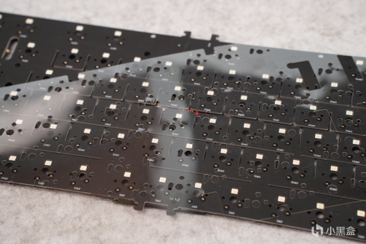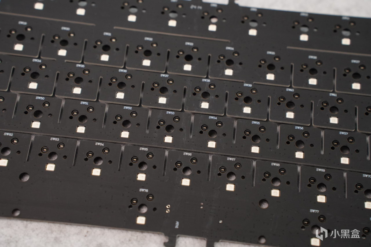 pcb这边使用的是下灯位的设计,好了,你们可以用你们很喜欢的侧刻键帽了,pcb做了单键开槽的处理,让键盘的整体手感更加的一致,背面可以看见键盘采用的是海木的轴座