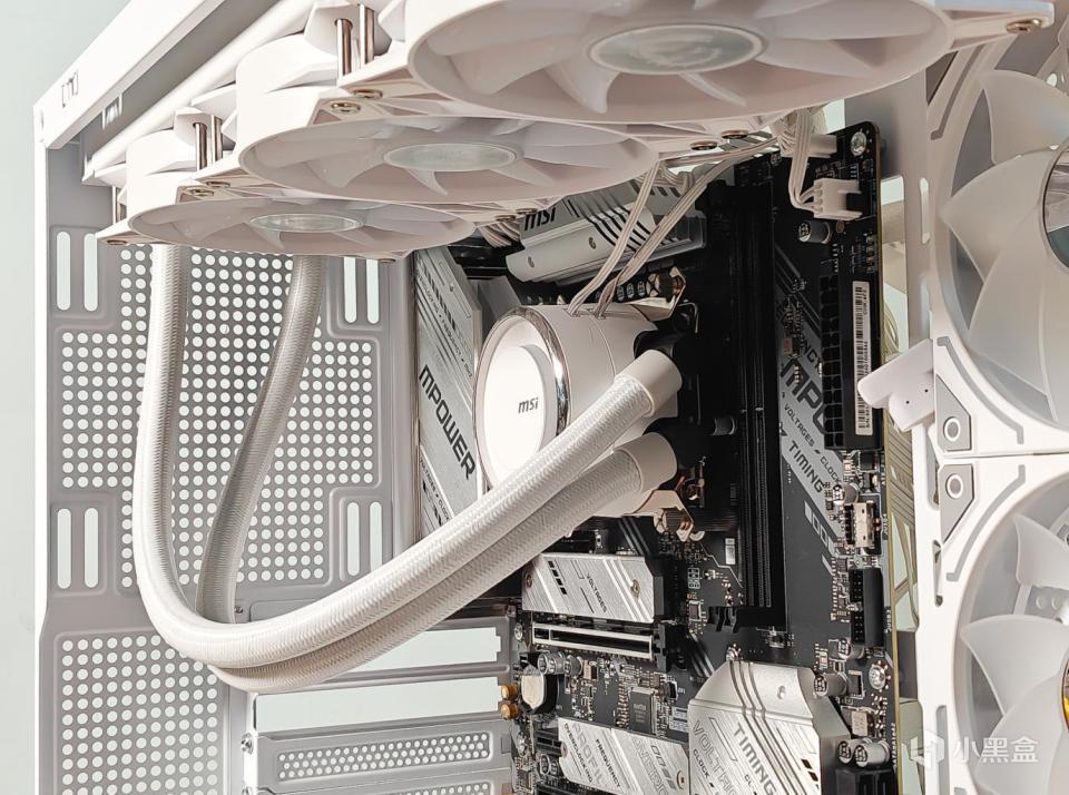 水冷散热器是微星的360水冷MAG CORELIQUID E360 WHITE,一款白色360水冷。这款水冷是全白色的,冷排、水管、冷头包括线材都是白色。