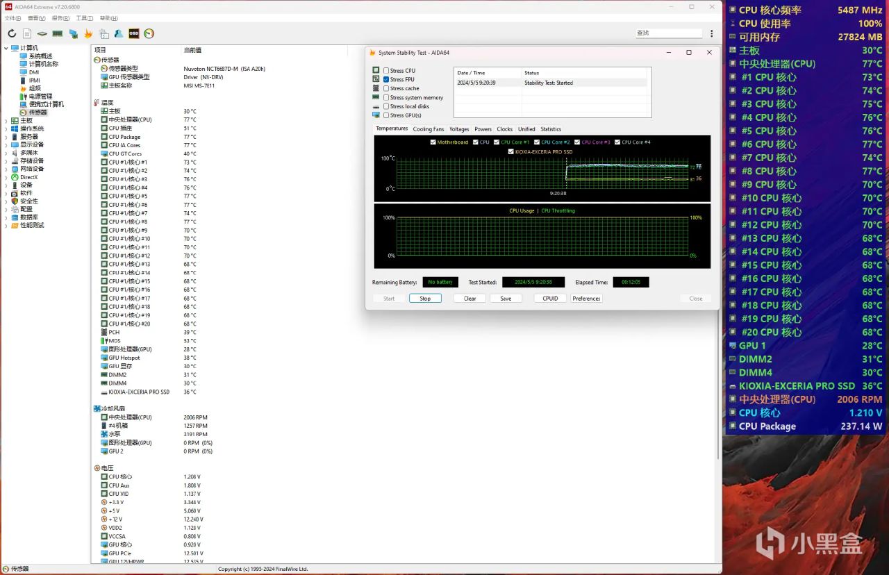 開啓0x123微碼後(可以搜索下我之前寫的文章——微星主板0x123微碼關CEP實測)再單烤FPU,i7-14700K的核心電壓下降到1.210V,CPU功率下降到240W左右。這時候通過影馳星曜G360水冷散熱器實測,CPU的核顯溫度僅爲77℃。
