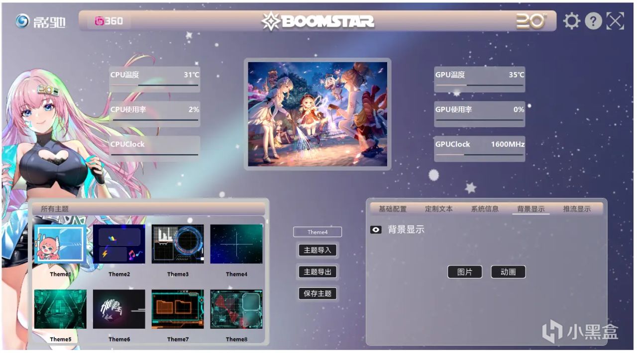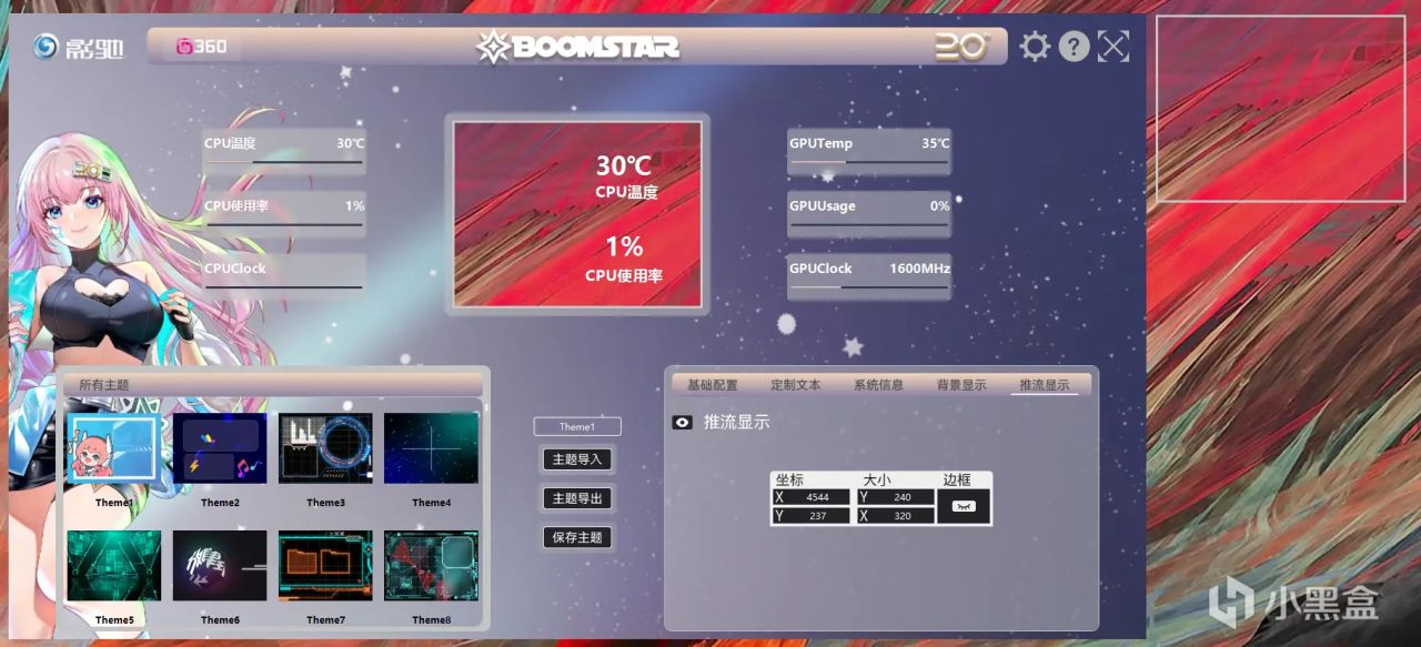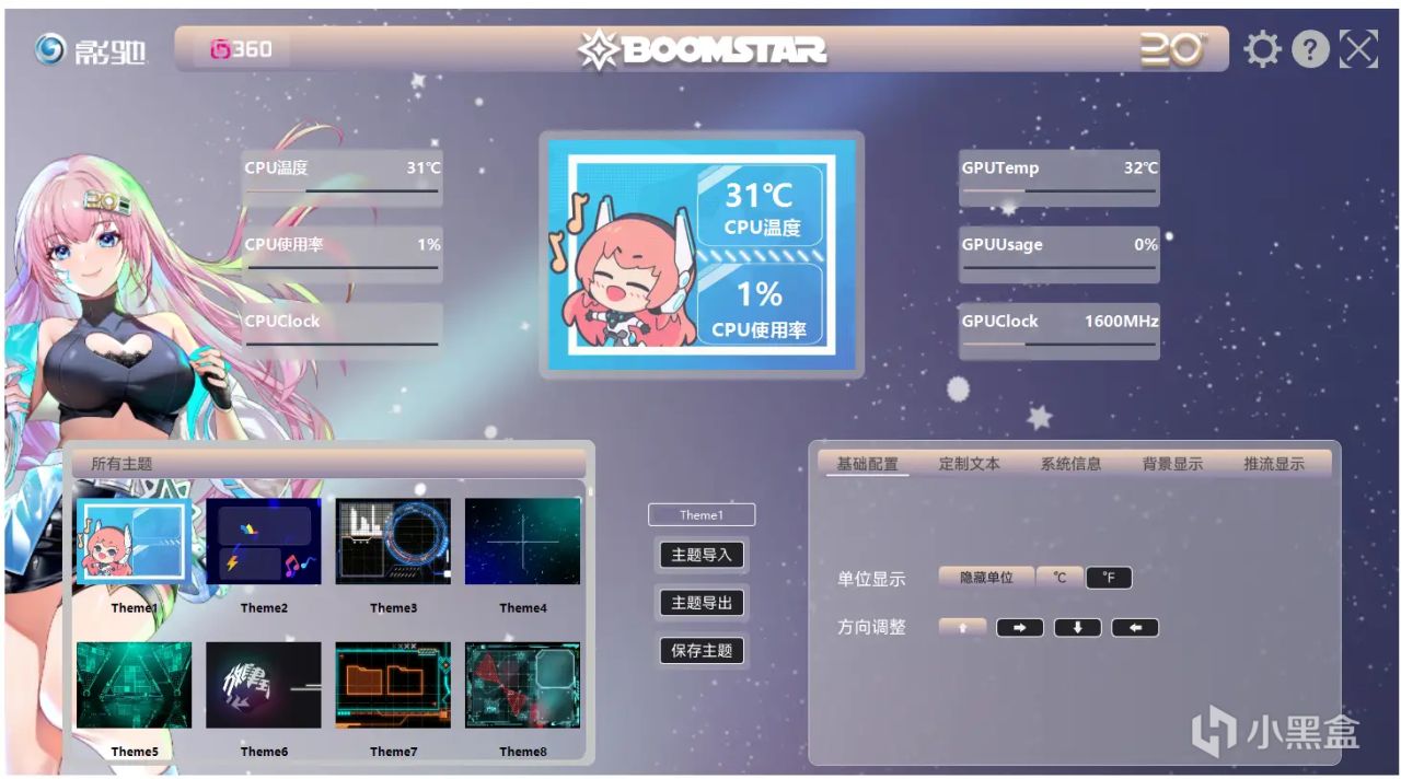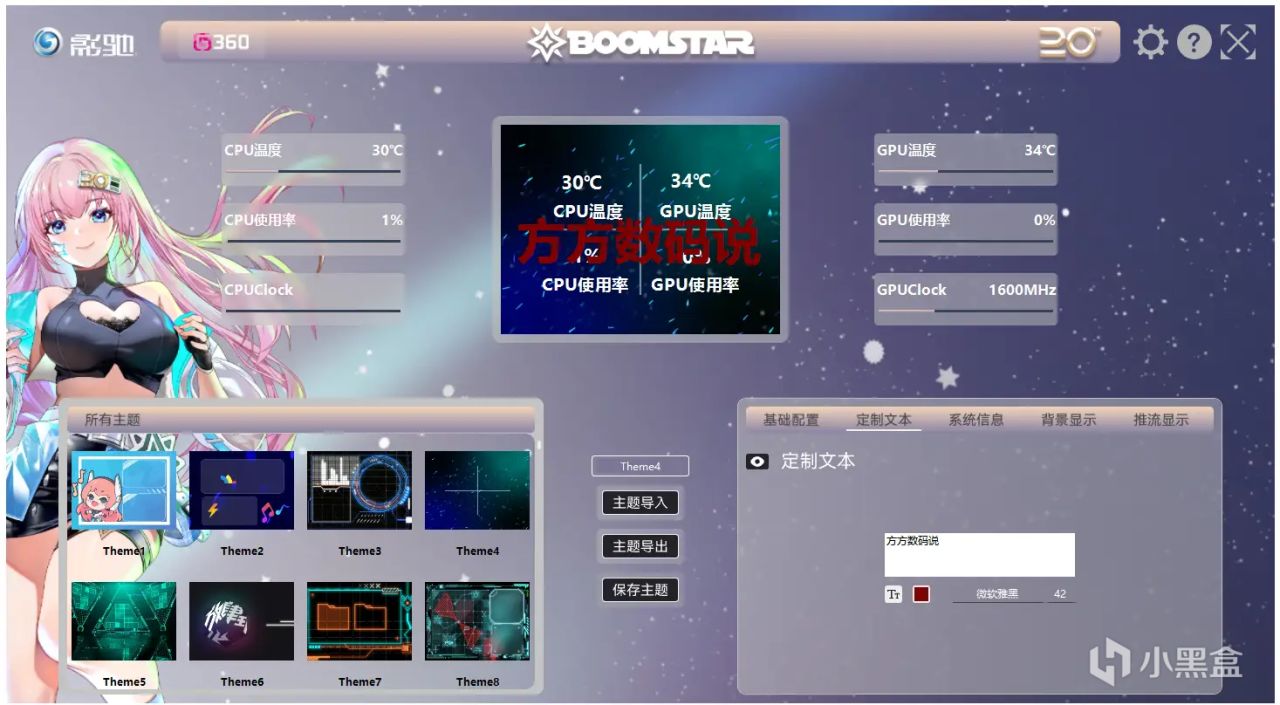 影馳星曜G360水冷散熱器自帶的BOOMSTAR控制軟件可玩性很高,比如默認就有很多主題可以選擇,並且還可以在其之上定製各種信息,包括更多的硬件監控以及定製文本等等。