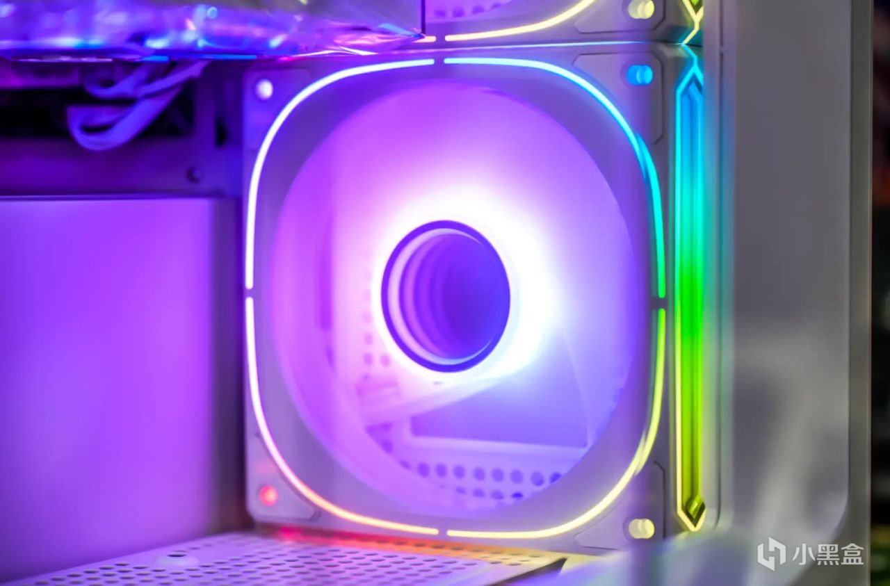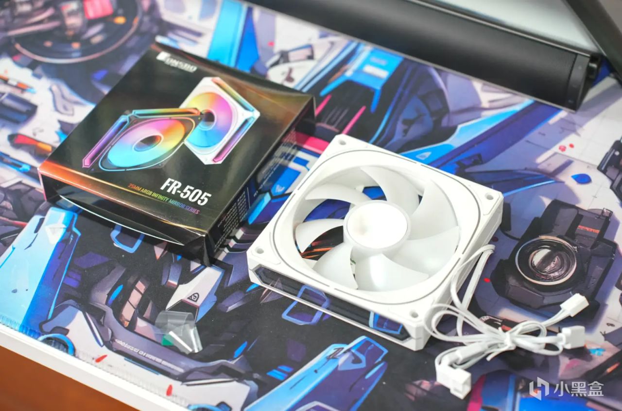 配套使用的風扇爲喬思伯FR-505,該風扇主要就是用於機箱內部,性能表現中規中矩,但ARGB燈效非常酷炫,不但扇葉具備ARGB燈效,在風扇的軸心與三側邊框的側面還具備了無限反射循環ARGB燈效,點亮後視覺效果極佳。