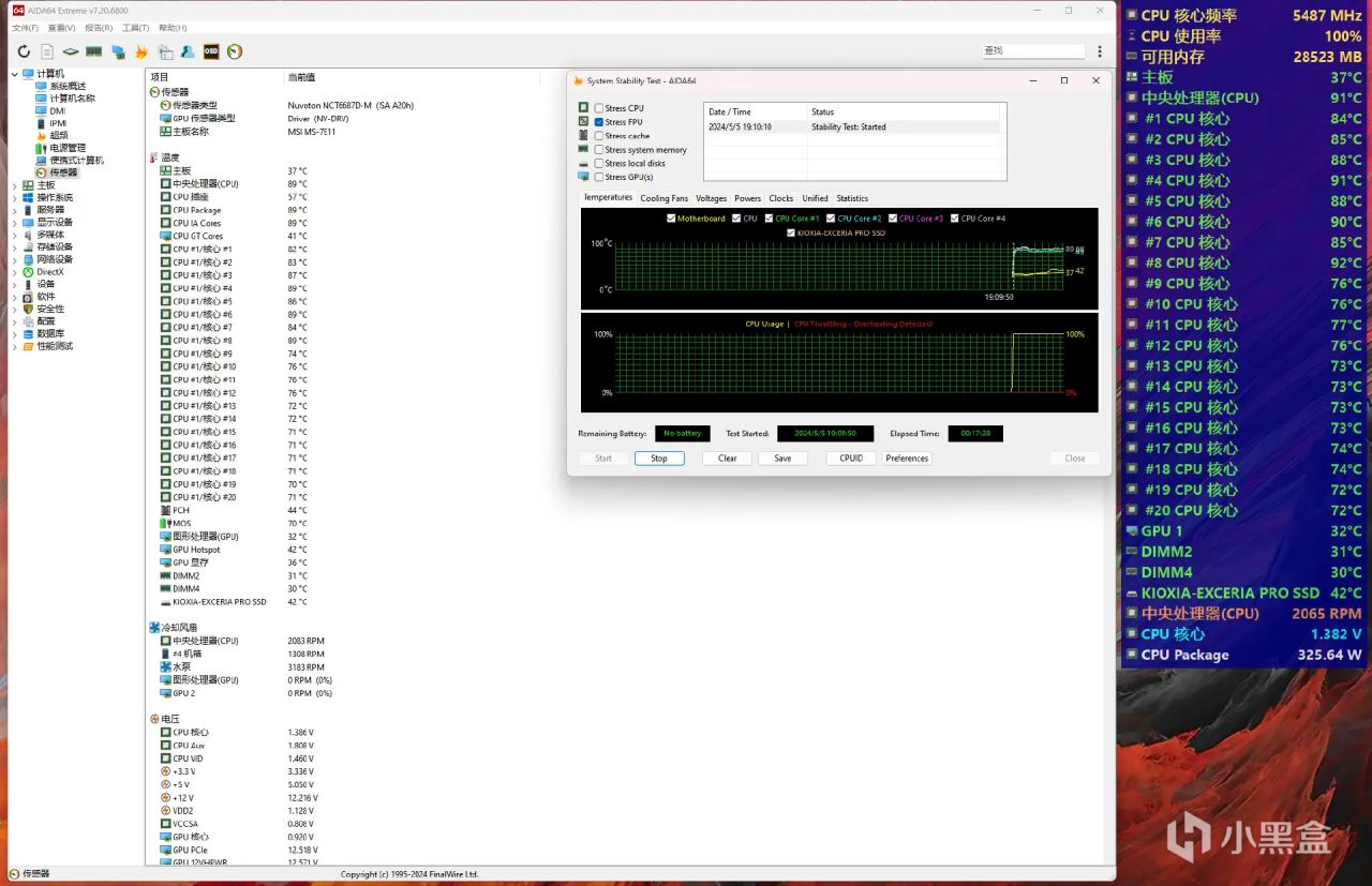 在室溫22℃的情況下,默認BIOS的設置下,通過AIDA64單烤FPU,i7-14700K的核心電壓達到了1.382V,功率爲325W左右,但在影馳星曜G360水冷散熱器的加持下,CPU的核心最高溫度僅爲91℃。