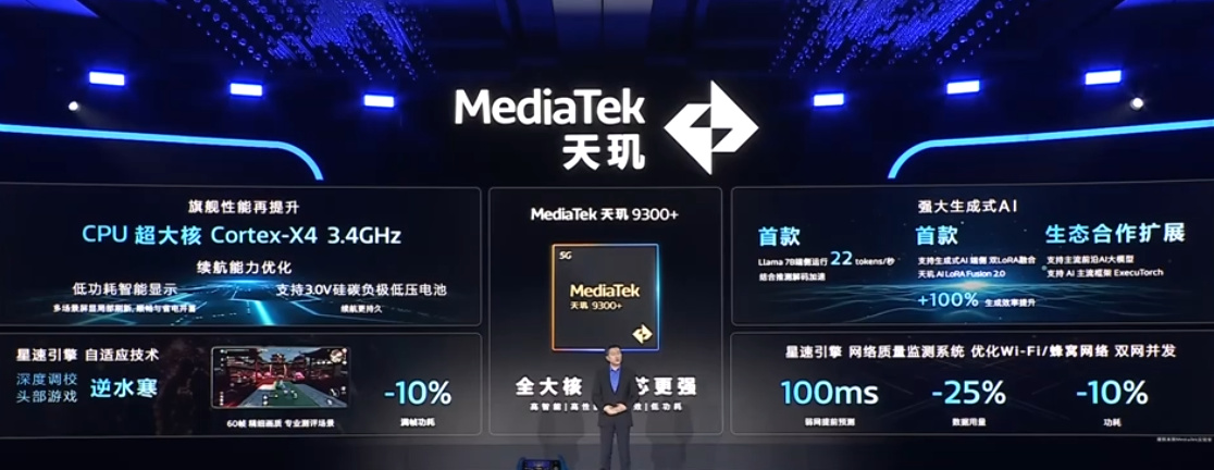 天玑 9300+ 号称“业界首款”实现更高速 Llama 2 7B 端侧大模型运行,速度达 22 tokens / 秒,并通过端侧双 LoRA 融合的天玑 AI LoRA Fusion 2.0 技术;“头部吃鸡游戏”满帧功耗降低 20%;搭载星速引擎,优化 Wi-Fi / 蜂窝网络,支持双网并发。
