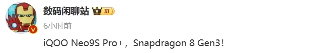 ——據數碼閒聊站爆料,iQOO Neo9S Pro主要升級點爲改用天機9300+,其餘規格大致不變,此外,iQOO還將推出iQOO Neo9S Pro+機型,配備驍龍8Gen3。