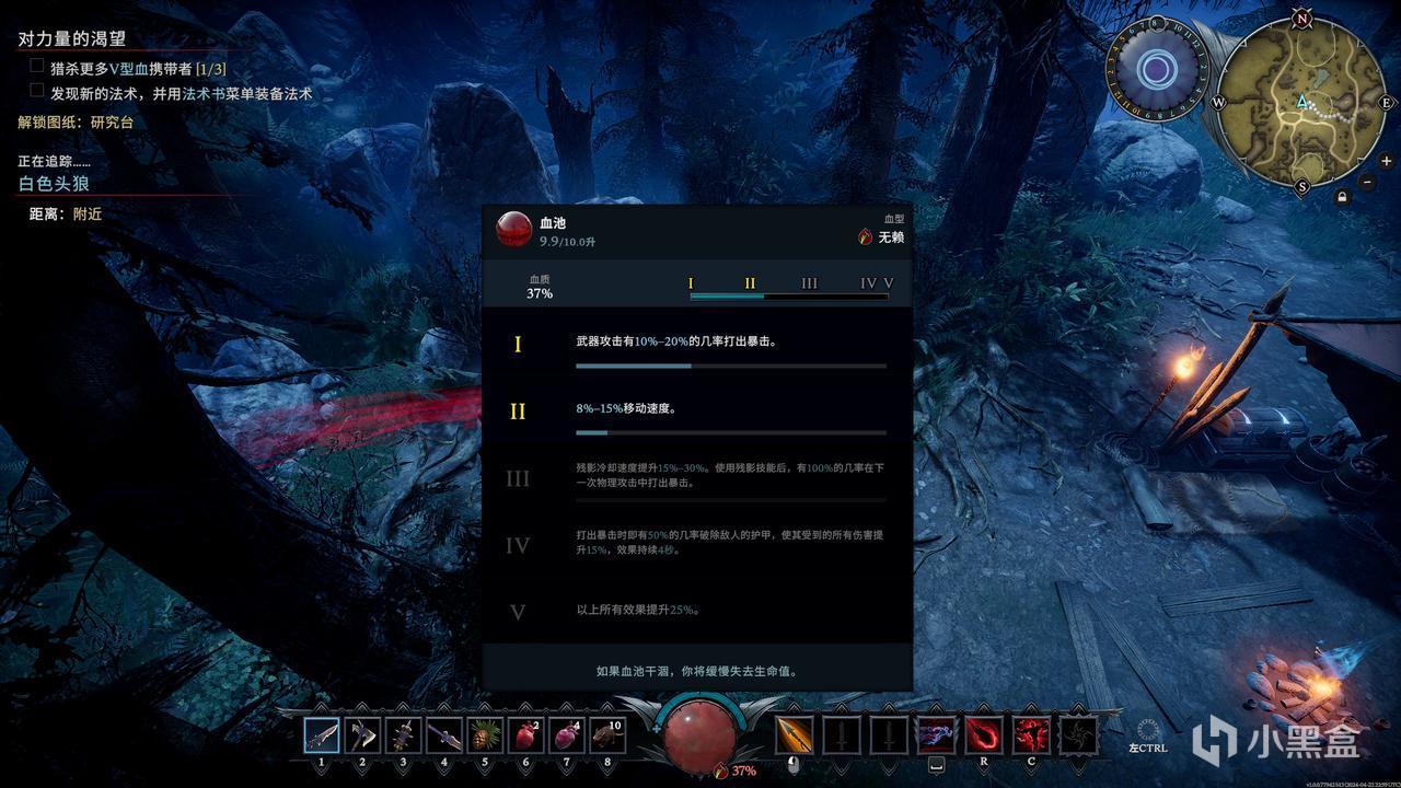 遊戲在狩獵V血型敵人這方面給予戰利品方面還是挺值得稱道——V血型敵人首殺大概率給技能點,比如任務鏈中會給特殊能力,比如變狼——+60%移速但是捱打取消、魅惑——把生物降到30%血以下可以帶回去變成僕從,不過需要4顆無垢之心或者200普通血合成的高級血(後者的配方同樣也較晚解鎖),此外遊戲中的強盜佔領區的箱子是定期刷新,且理論上能開出這個tier所有的物資,可以帶來很多意外的收穫(比如做裝備的配方書),而50頁紙可以在研究臺穩定觸發新科技,也爲刷刷刷提供了保底。
