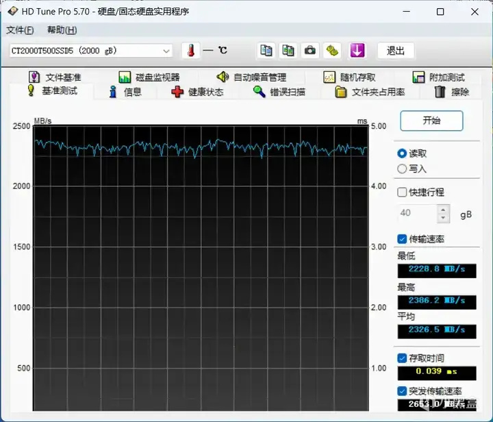 先来使用CrystalDiskInfo来看一下SMART信息。可以看到英睿达T500 为足容的2TB,甚至还超了0.3GB,并支持NVMe 2.0协议标准。通电时间为0小时,全新,全新。