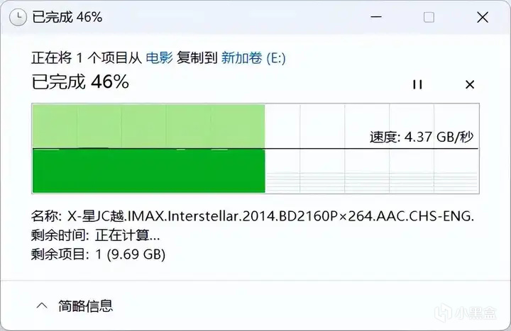 在日常传输文件的速度上,我把18G电影对盘拷贝,英睿达T500速度稳定在4.37G/s,速度上还是很快的,同时也考验了固态硬盘的读写同步。