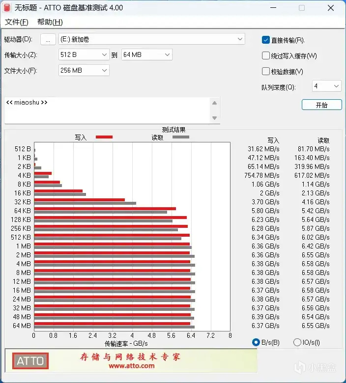 使用ATTO测试不同大小文件写入速度,16KB到32KB是一个提升明显的趋势,大于等于32KB的文件写入速度基本稳定在5GB/s以上,写入速度稳定在6GB/s以上。读取速度在16MB时能达到6.58GB/s,性能也得到了充分发挥。