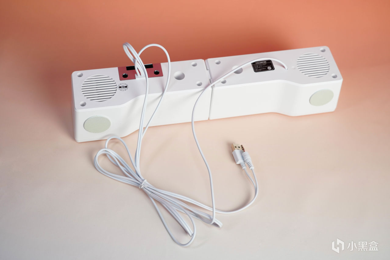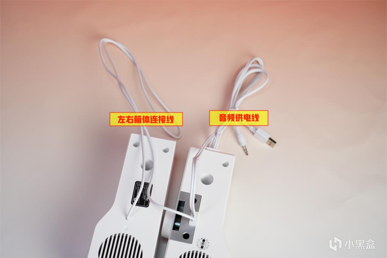 线材部分,分为两大种,三小根。一根左右箱体的连接线、一根由音频线&USB供电粘合一起的线材。线材长度预留够长,同时箱体间连接线材不可拆卸,在理线、藏线上会有些许难度。