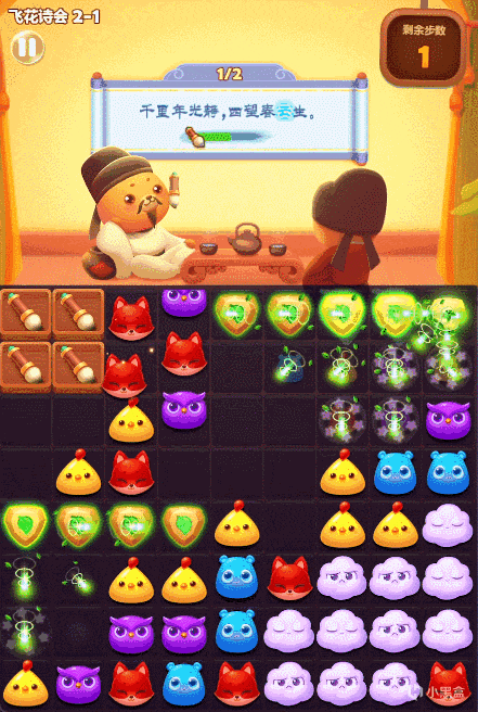 在基础消除玩法之外,《开心消消乐》也在持续通过活动来丰富玩法类型。以10周年版本为例,游戏新增加了飞花诗会活动,对应设计了独立关卡,玩家收集毛笔来补充诗句。通过将诗词的绝美意境与游戏障碍的融合,为消除带来了更多的惊喜。