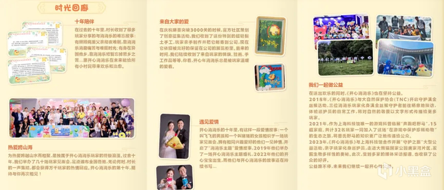 首先是陪伴感。《开心消消乐》是在大家见证下逐步成长,同时它也见证了无数玩家的成长。在“十年纪事”中,官方单独做了一个板块呈现“玩家故事”,涉及公益、爱情、聚会,讲的不是玩家怎么玩游戏,而是在《开心消消乐》陪伴下诞生的“关联”。