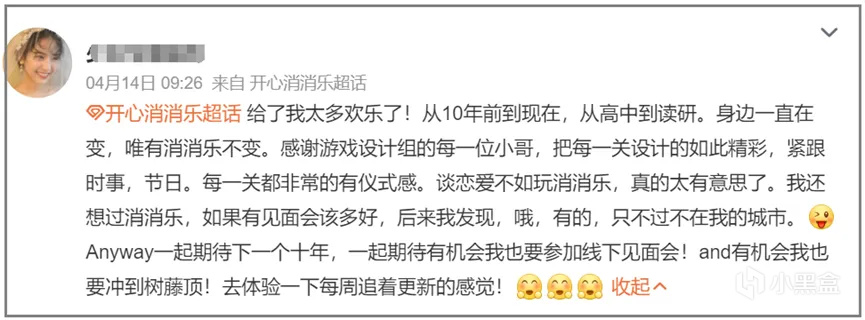 “比谈恋爱的时间都长”、“手机里唯一永远都不会卸载的游戏”、“不管怎么换手机,第一个下载的肯定是《开心消消乐》”,在很多玩家的分享中我们能发现类似的说法。