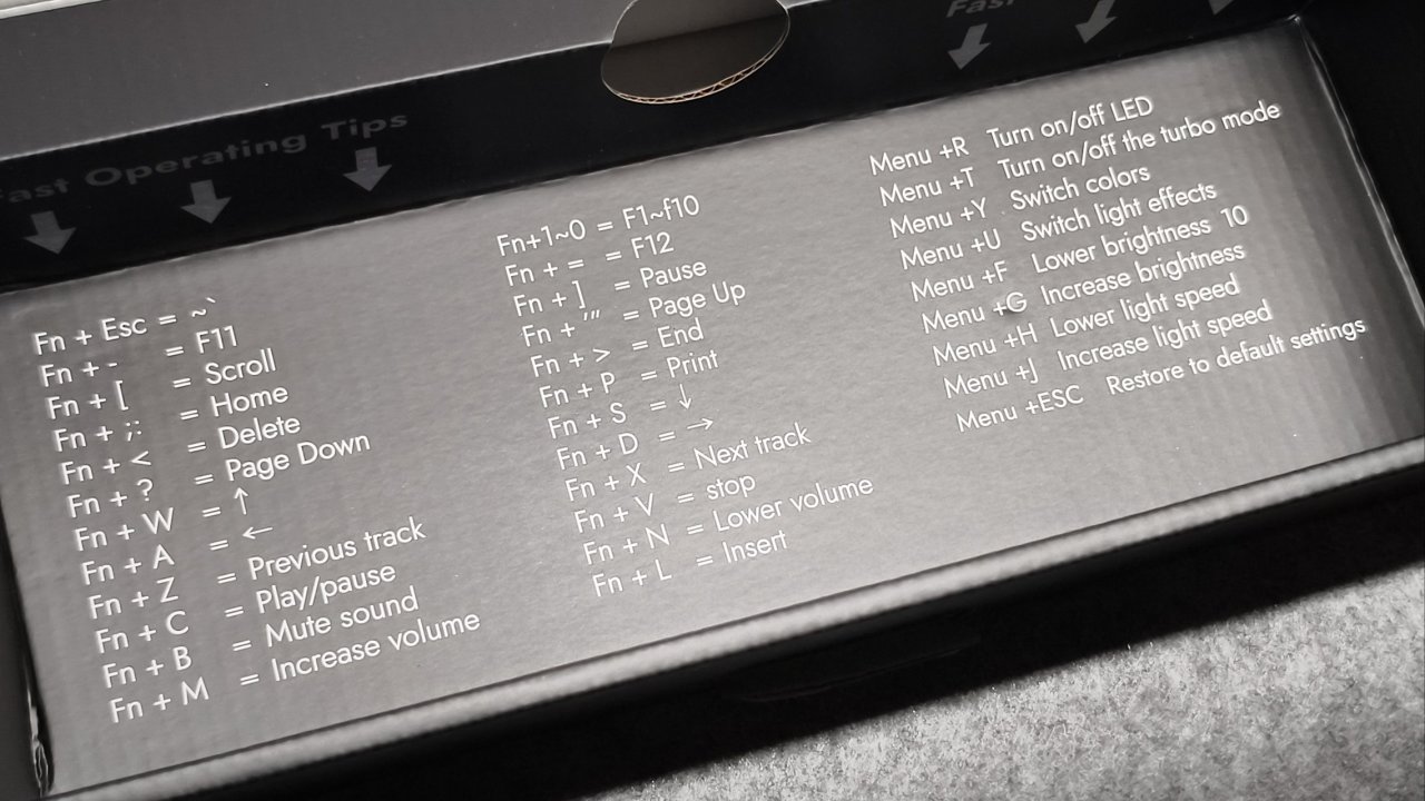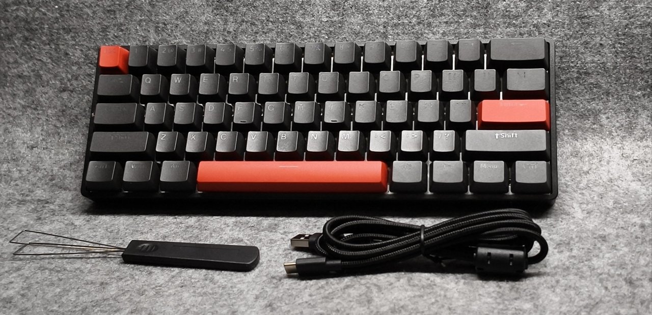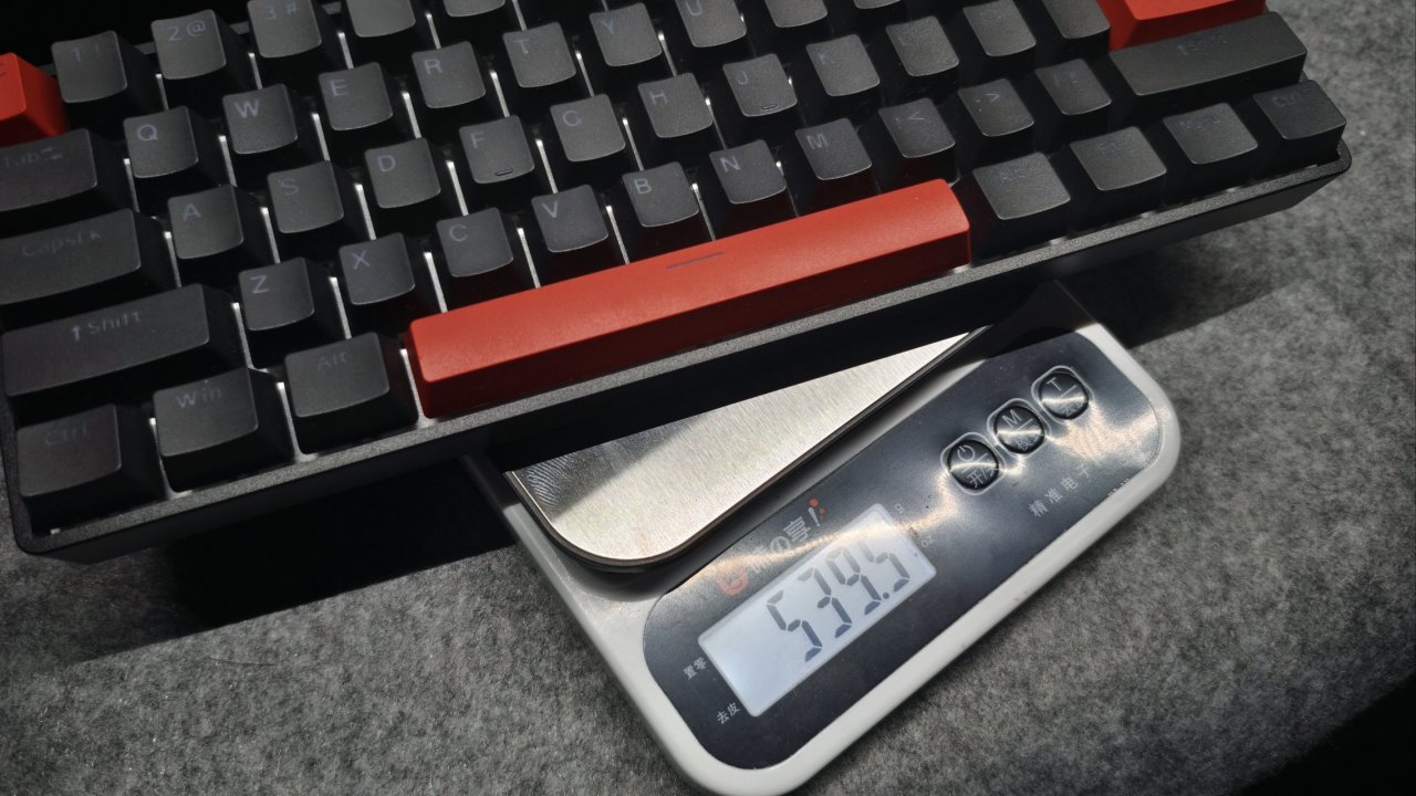 這把鍵盤呢是屬於小配列鍵盤,只有60個鍵位,並且與前代的G65相同,都是塑料邊框,表面也做了一些輕微的磨砂處理。因爲塑料+小配列的原因,它整體的重量是比較輕的,只有539.5g。這樣的重量日常打遊戲啥的也比較方便,如果你經常外出,甚至還可以把它塞到挎包裏面,小配列加輕嘛,我覺得大部分人應該都是可以接受的