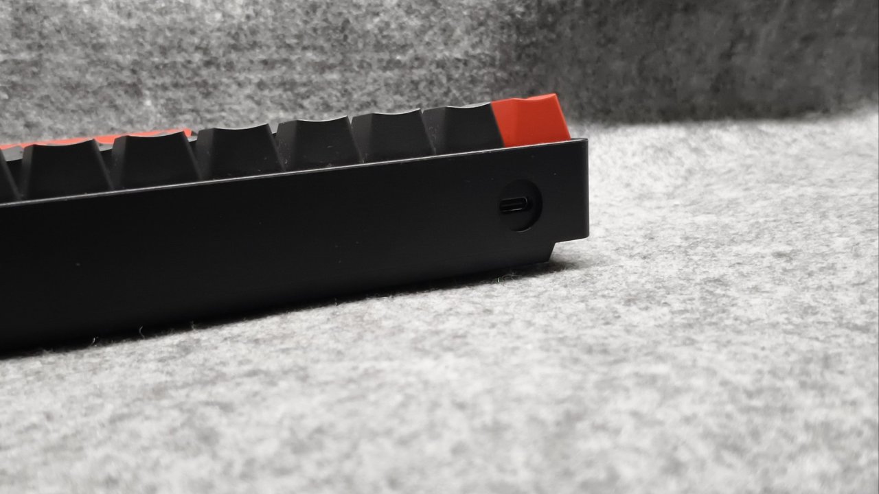 這把鍵盤呢是有線的,但是這挺正常的,市面上的磁軸鍵盤我記得除了賽睿apex pro tkl(這把鍵盤好像2000塊吧)都是有線,這也是因爲霍爾比較費電,沒辦法的原因。所以鍵盤的正面呢你只能看到一個type-c插口