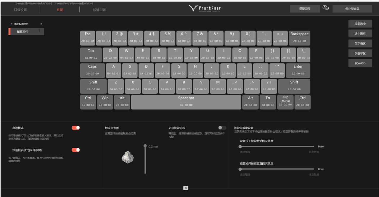 我相信不少哥們選擇醉鹿的原因不僅僅是因爲他是國內首家做磁軸的鍵盤,還是因爲他的網頁驅動做的很不錯,身體看起來簡潔方便,調節迅速。對於字母區,數字區,“WASD”你都可以快速的勾選,然後進行一個調節。除此之外你還可以調節一下鍵盤的一個燈光,值得一提的是是當你開啓極速模式之後,它的燈光會固定成藍色,當然有些rgb愛好者可能會說,那我把它關閉不就好了嗎?但是我在這裏提個醒,他是可以優化你的觸發與停止,整體更加精準。