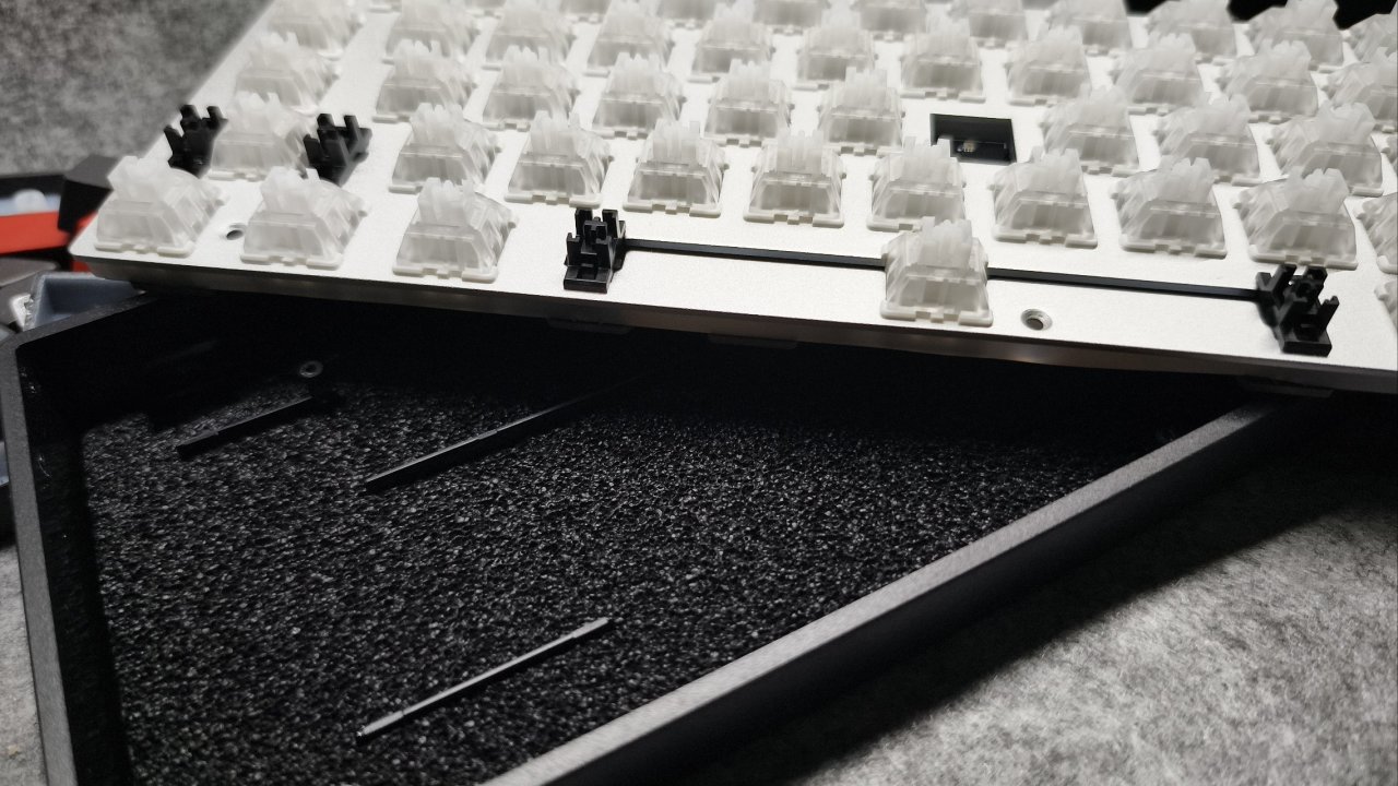就聊到這把鍵盤是船殼了,那就給大家看一下里面的填充結構長什麼樣子吧。拆解後大家可以看到,裏面的填充很少,就只有PORON棉+EVA泡沫墊。但也是因爲這只是個遊戲鍵盤,所以你也不用像那些客製化鍵盤一樣堆那麼填充,去追求那個手感以及聲音