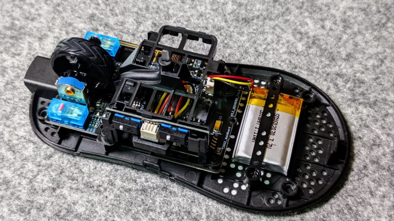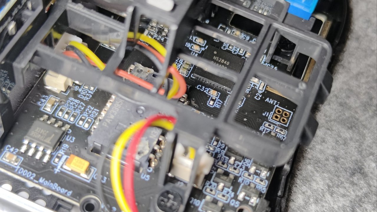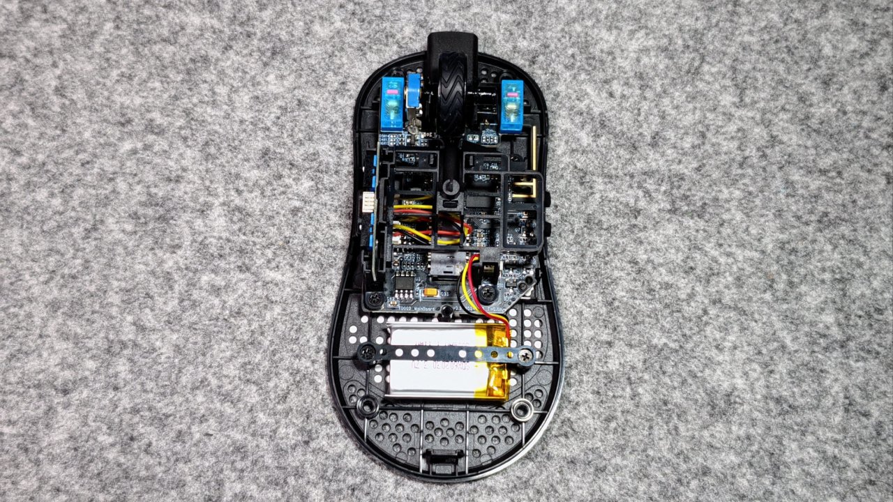 打开鼠标,可以看到内部的配置,比较难受的地方在于底部为了减重做了卯榫结构,拆开时须小心。