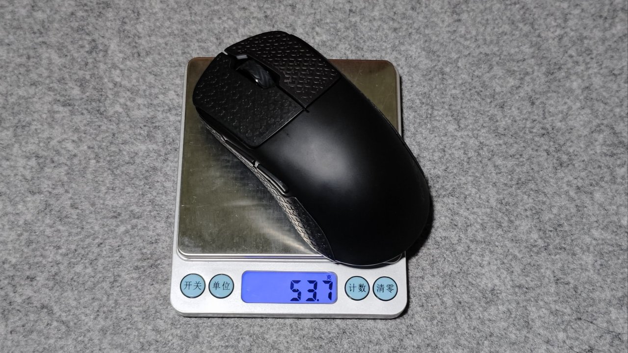 重量方面,装上防滑贴是53.7g,不装的话是50g,轻量化的设计也符合大家当下的需求