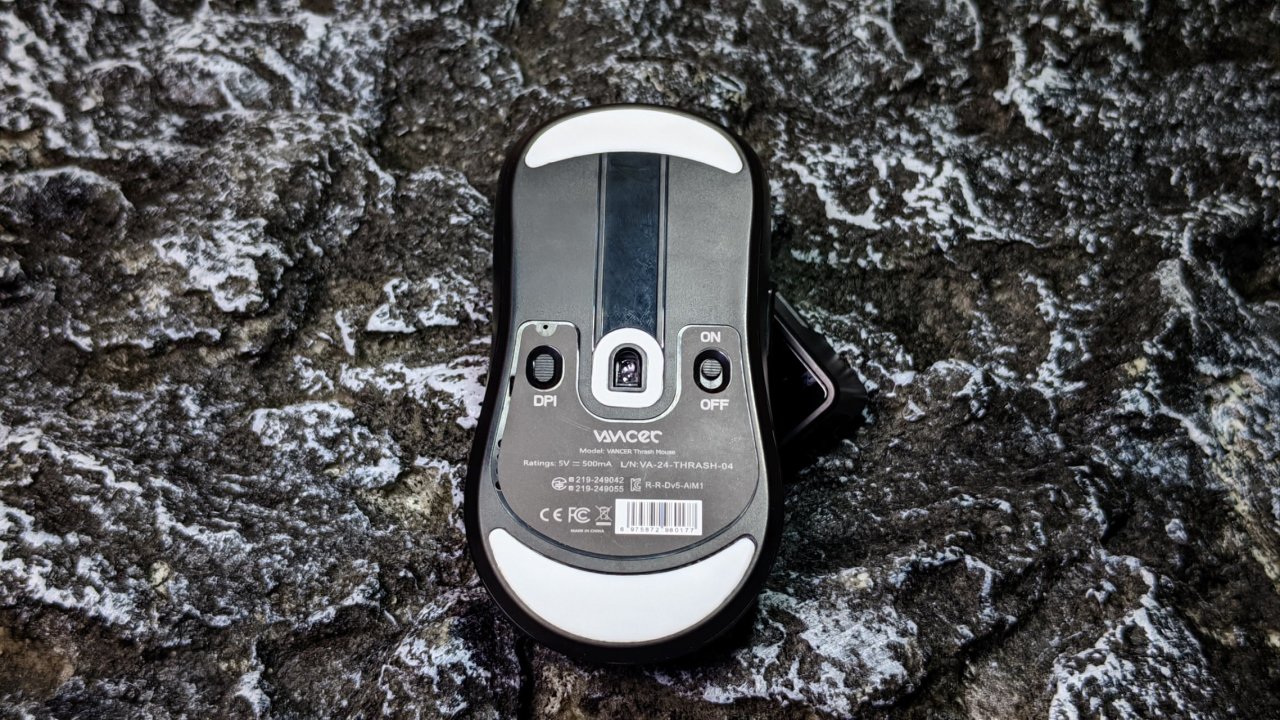 底部一个开关键,一个dpi调节键,三处防滑脚贴,面积还算不做,在吟虎星云的表现上比较精准,X轴的速滑效果很不错。