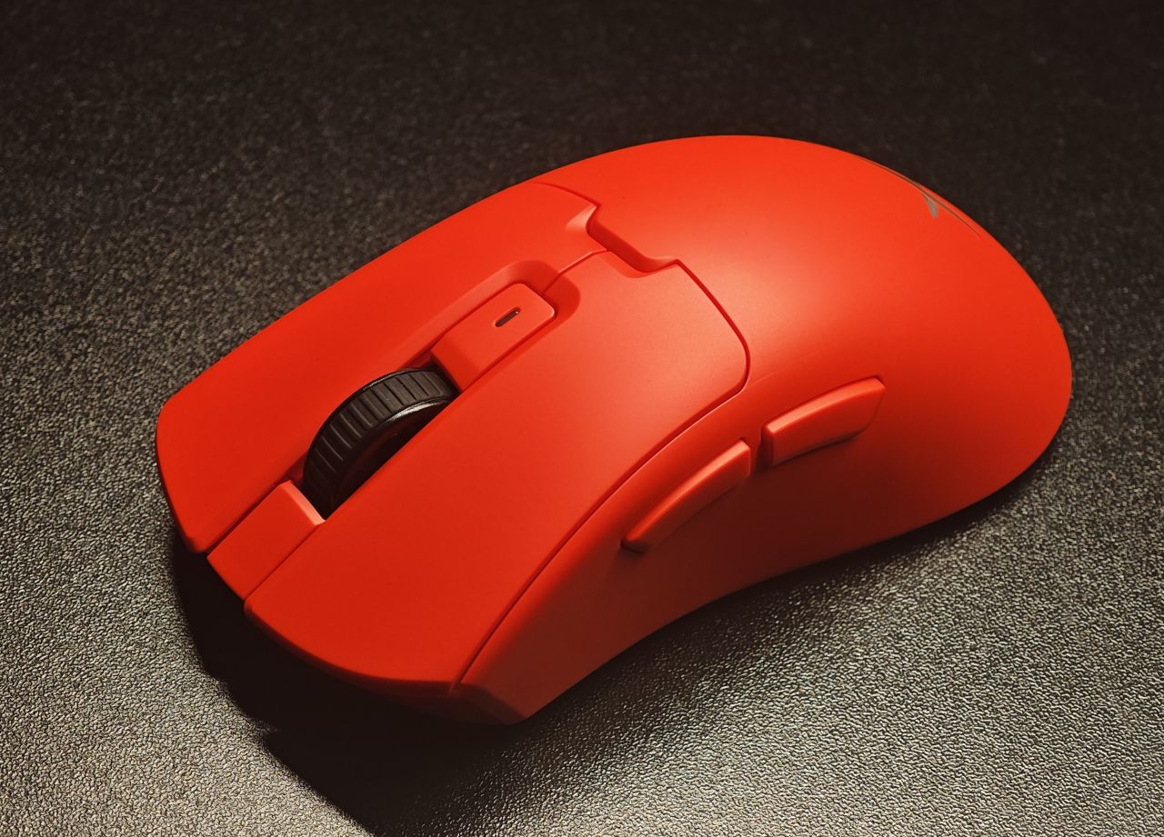 整个鼠标都比较干净,没有防滑处理。鼠标表面涂有哑UV涂层,光滑圆润、手感细腻。侧边有两个侧键,可以自行设置自己想用的自定义键。侧边内凹收腰,大拇指放置比较贴手舒服。