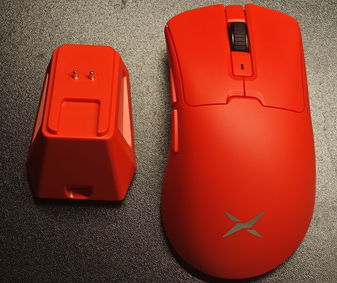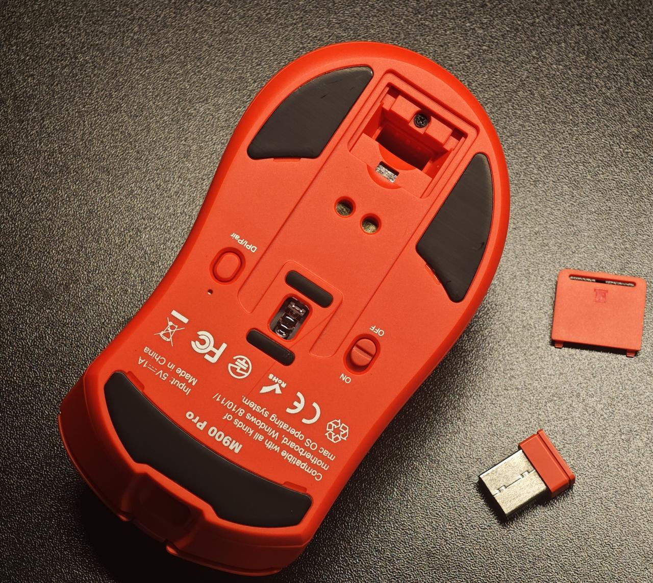 鼠标的尺寸为126.6*69*41.8mm,适合中大手使用。重量为63g,轻量化设计,握起来重量偏轻。鼠标和充电底座的整个外壳是红色的,下面是多彩的logo,红色和黑色的经典搭配,整体颜值是非常好看的。采用非对称右手人体工学设计,握起来手感不错,适合趴握。模具做的像雷蛇的蝰蛇,用过蝰蛇再用这款M900PRO上手非常快,红色的龙年款式也有点像蝰蛇V3专业版 FAKER限定款一样的红色。