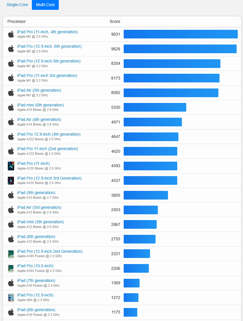 作爲對比,目前 Geekbench 收錄的 2022 款 iPad Pro 12.9 英寸機型(3.5GHz 的 M2)單核跑分爲 2539 分,多核 9628 分,所以這個 M4 跑分要是屬實的話提升幅度可謂相當大,單多核提升約 48.37%、52.44%。