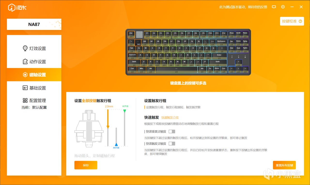 提起磁轴键盘,基本上都得提起驱动,正所谓溢价全在驱动上,大家也都知道公版驱动很难用,这次的NA87 MAG虽然才199,但是采用的是艾石头自研的驱动,页面简洁明了,常见的磁轴功能都可以完成设置,交互过程很舒服,打开基础设置页面也可以看到,回报率是默认来到了8K,对应的延迟方面也是低至0.125ms。