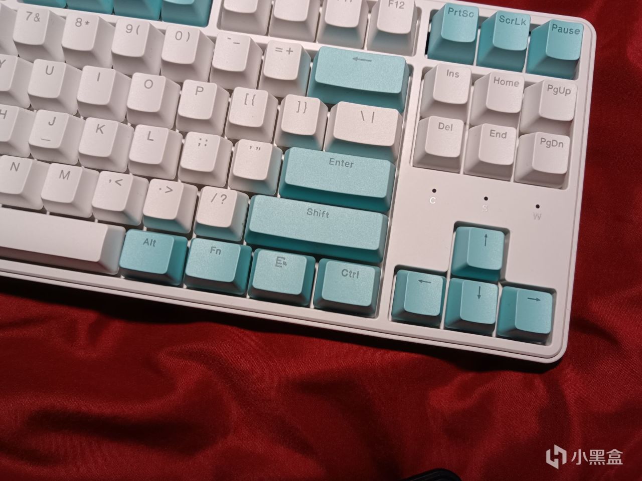 方向键上方是做了一个指示灯,与键盘其他部分是做了遮光处理的,但是三个指示灯之间并没有做遮光,不过因为离得比较远,所以灯光并不明显,问题不大,这一点好评。