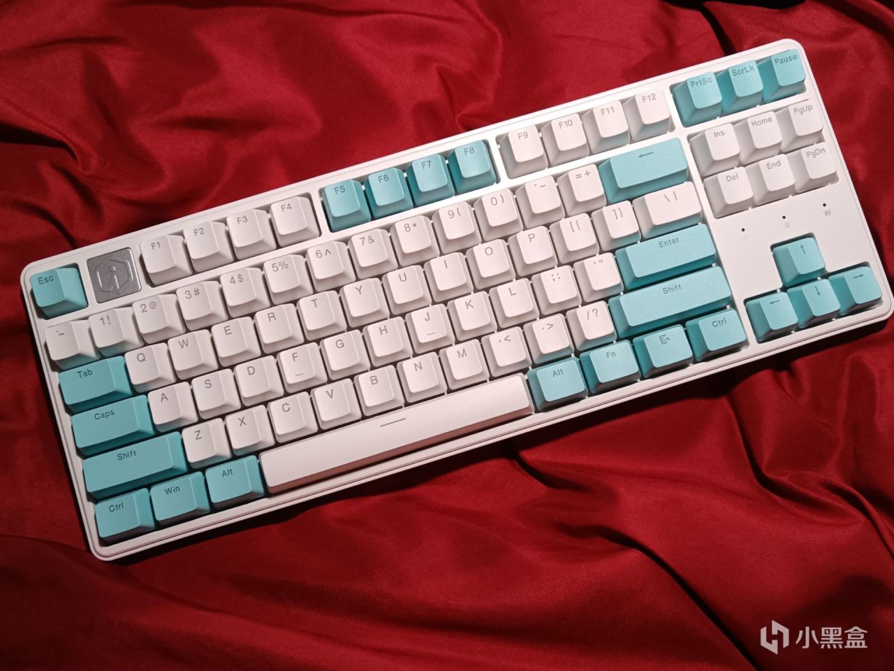 首先就是左上角ESC按键与F区之间的空间,艾石头是做了一个带有品牌logo的金属铭牌,似乎是铁质的,表面看着像是喷砂工艺做的,触感还是比较细腻的,并且铭牌的颜色是跟着键盘整体的颜色走的,99这个价位都安排上金属铭牌了,真不错。