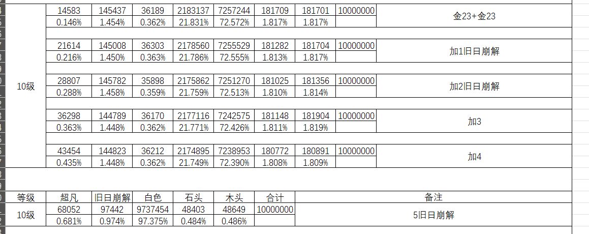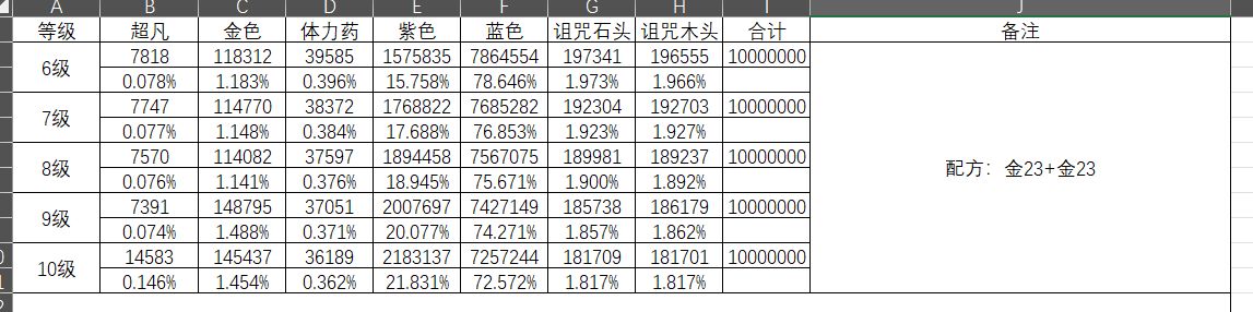 因为上面的两个理论,所以配方是一样的,同时也是单一变量了。我们可以看到6-9级每一级都会稍微减少超凡物品的产出概率,而9-10几乎翻倍了,其他的具体就自己看一下了。