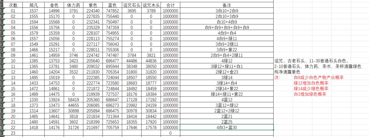 理论1:在同一炼金等级下,配方中无特殊物品时,物品的产出概率不会因为配方的改变而改变。