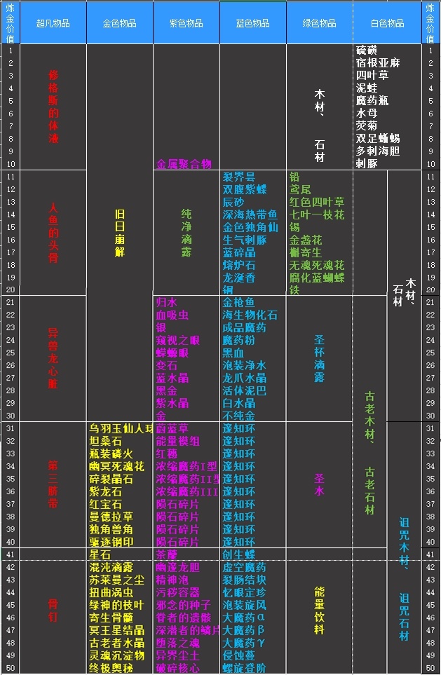 假设1:在进行炼金产物计算时,一般顺序为从能够产出的物品颜色最低级到最高级。