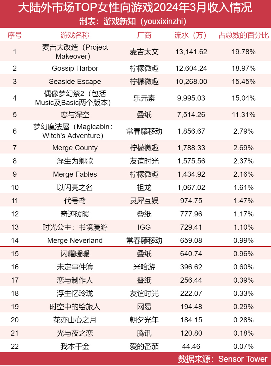 注:红线为国产游戏在大陆外市场收入排名300名分界线。未上线大陆市场的游戏,统计范围仅包括该排名300名以内的女性向游戏;同时在大陆内外市场上线的女性向游戏,其大陆外收入可能不在此排名范围内,但仍全部纳入表格作为参考。