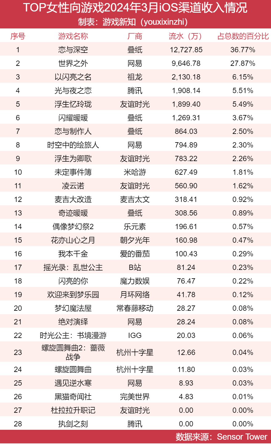 把目光放大到目前市场上已有的头部及中腰部产品,可以发现统计范围内的产品三月里在iOS渠道共创造了约3.46亿的流水,而《恋与深空》和《世界之外》一共占到了总数的约65%。另一边,换装赛道中的《以闪亮之名》也已经大大超越了「暖暖」IP。女性向市场「四大国乙+暖暖」的格局恐怕已经改变了。