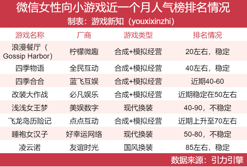 小游戏市场由于也偏向休闲、碎片化,格局与大陆外市场非常相似。由于小程序包体大小的限制,像《恋与深空》《以闪亮之名》这类依赖技术力的游戏就施展不开。这里就成了低成本休闲女性向游戏的战场。游戏新知整理了近一个月曾进入微信小游戏畅销榜和人气榜TOP100的小游戏,能看出它们的类型非常集中。
