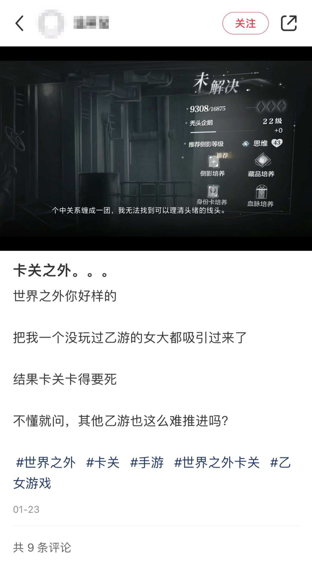而《世界之外》的特点是地道的「无限流」网文剧情,不仅文本量大管饱,连玩法也最大限度地降低了门槛,让游戏向着「能玩的网文」方向靠拢。可以推测的是,它对于网文受众会有额外的吸引力。在社交平台上,表示自己「没玩过乙游」而被剧情吸引来的玩家非常常见,她们也经常因为不理解游戏机制而寻求帮助。