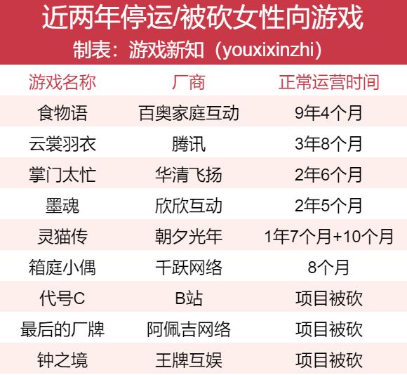 本文的最后一张表格,是除了前面已经统计到的新游之外,在近两年里停运、无限期停止活动更新和被砍的女性向游戏。此外完美世界的《梦间集天鹅座》虽然已无法下载,但实际上仍在继续运营,故未统计进表格中。有新游跑出,也有游戏因为各种各样的原因退场,似乎是市场正常的「新陈代谢」。做游戏从来就是九死一生的事,女性向游戏也不例外。