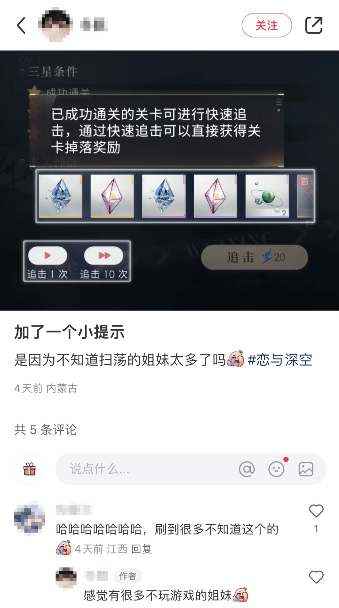 就《恋与深空》而言,细致真实的3D建模效果是它最大的扩圈因素,「看脸入坑」的玩家相当多。一些玩家此前从未接触过同类游戏,对于扫荡等基本功能都不熟悉。以至于在4月26日的版本更新中,也就是上线三个多月之后,游戏还甚至特意添加了一段引导,提示玩家扫荡功能的用途。