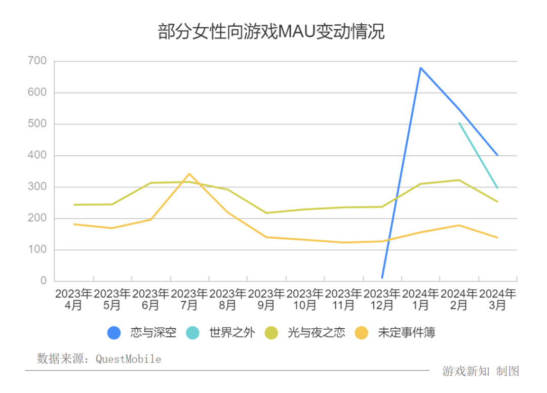 这几款头部新品大放异彩,也影响了整个女性向赛道的市场格局。一些老牌头部产品的统治地位因此大受挑战,但值得注意的是,它们本身已建立起的用户根基并未受到太大影响。