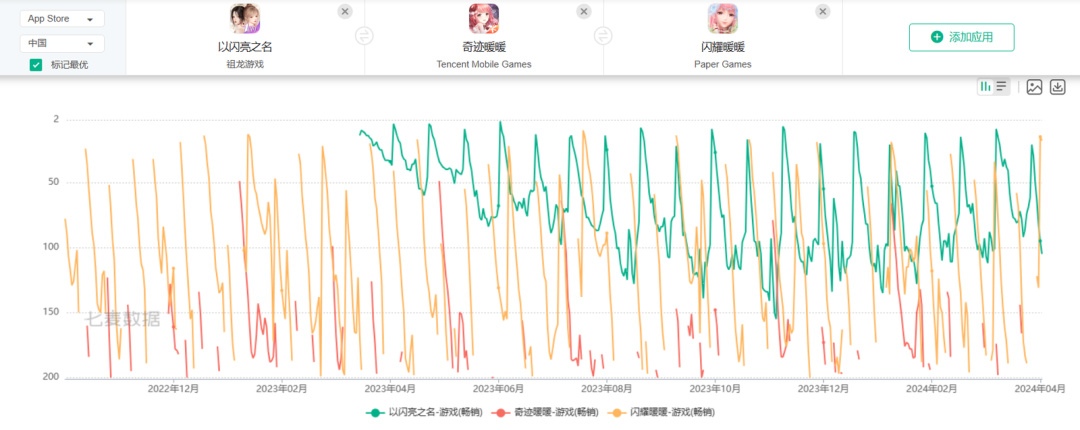 但这并不意味着新游戏抢走了老游戏的用户。以《光与夜之恋》《未定事件簿》和两款「暖暖」IP游戏为例,从畅销榜排名来看,新游上线前后,老游戏的排名并未出现明显的下滑。