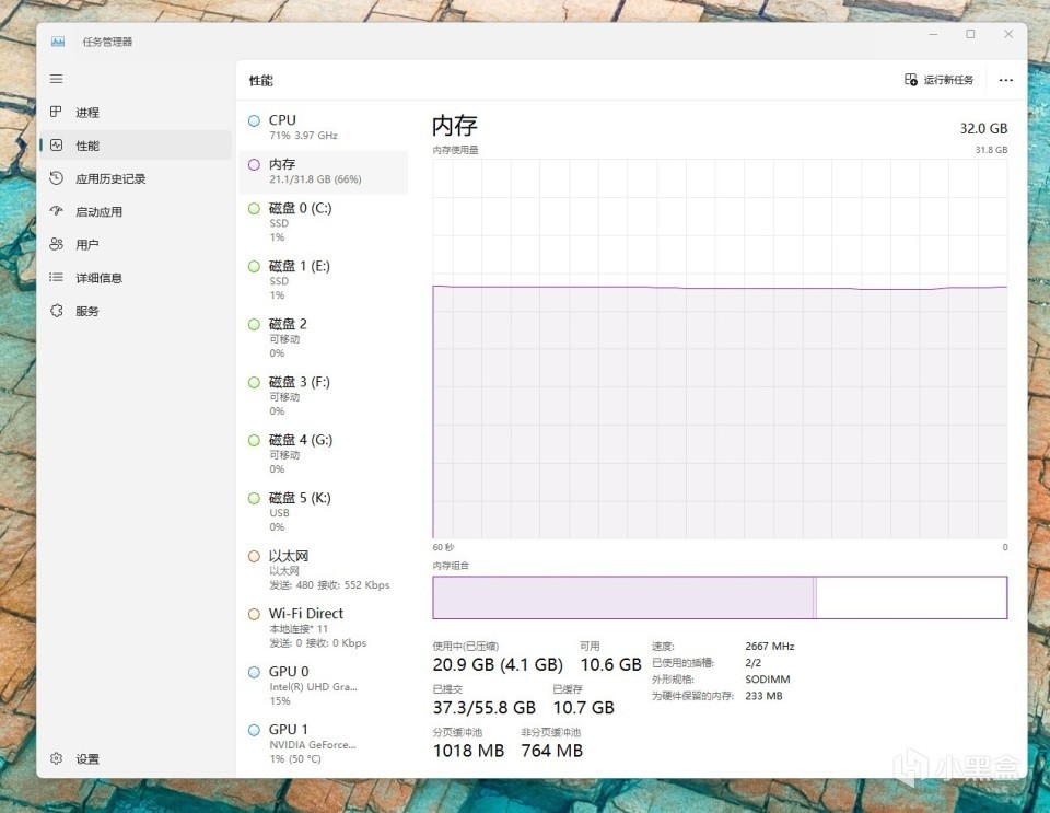 重新啓動再進入到系統裏面,感覺系統順暢多了,反應也靈敏多了。各種軟件打開,瀏覽器窗口同時開N個,依舊流暢。圖形處理軟件導入的速度也快了,圖片預覽的速度也快了。任務管理器看下,內存使用了20GB左右,剩餘可用11GB左右。