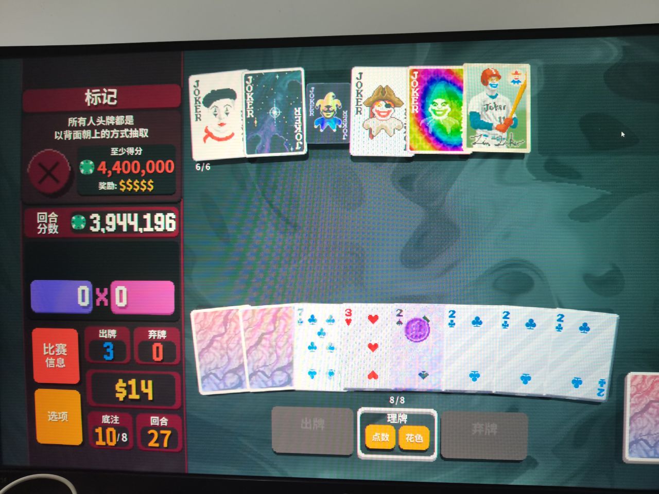 後面一把玩到了啞劇演員,之前也碰到過好多次啞劇演員,但是都沒用上。這一次啞劇演員+小小丑+棒球卡,其他小丑也不太行,上限還是不夠高,到30回合就g了,不過看着乘倍率確實爽。要是有一個藍圖,那就絕殺,可以麼得。